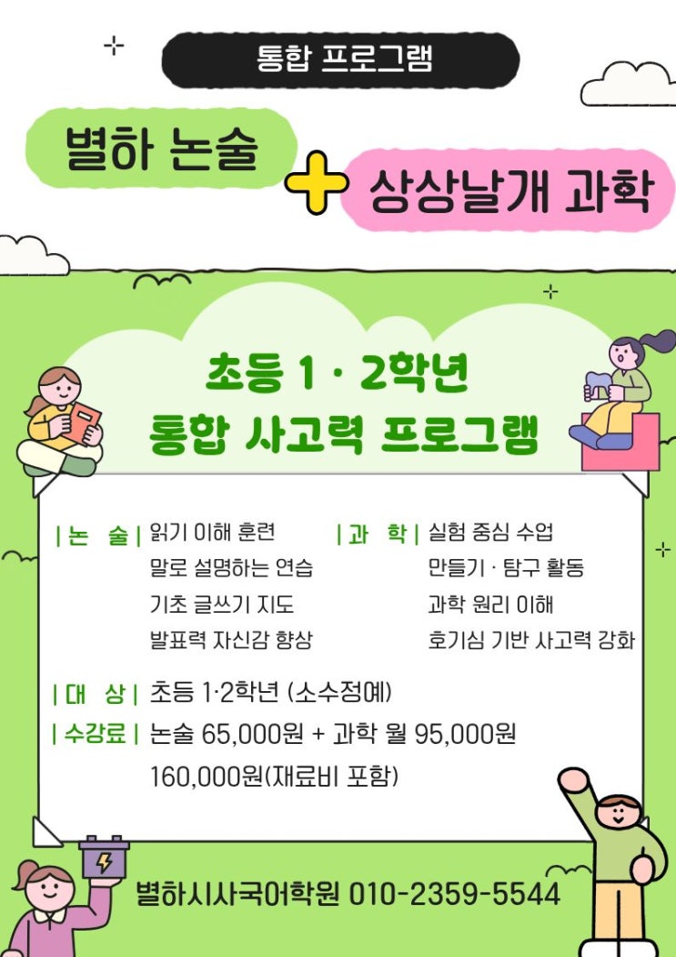 안녕하세요~^^ 별하시사국어학원입니다~ 요즘 초등 1·2학년 아이들을 보면 참 귀엽고 사랑스러운데 한편으로는 걱정도 됩니다. 말을 참 잘하는데 생각을 끝까지 이어서 설명하는 건 어려워하고, 읽기는 하는데 내용을 자기 말로 정리하는 건 힘들어하는 아이들이 많아요. 이게 아이들이 부족해서가 아니라 연습할 시간이 없어서라고 생각합니다. 초등 저학년은 성적을 올리는 시기가 아니라 생각하는 근육을 키우는 시기라고 믿어요. 그래서 이번에 논술과 과학을 함께 묶은 수업을 만들었습니다. 아이들은 앉아서 듣는 수업보다 직접 해보는 수업에서 훨씬 많이 배웁니다. 읽고, 말하고, 써보고 만들고, 실험하고, 질문하는 과정 속에서 자....... <img src="https://blogthumb.pstatic.net/MjAyNjAyMTFfNDYg/MDAxNzcwODA2ODUxNjE2.bZ6jMA3Wdd9u5V4hPX4z2xK9xw4GHUueoTeifVuCDLUg.gqPqg5EZi78Cxj9SoNhqVU6qyl5dksnDBqG92V1zKjwg.JPEG/%B3%ED%BC%FA%B0%FA%C7%D0.jpg?type=s3" />