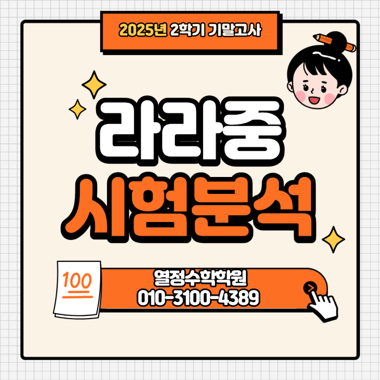 안녕하세요. 하위권에서 반등이 필요한 성적을 최소 3등급까지 올려줄 수 있는 열정수학학원 입니다. 오늘은 저 열정지기와 함께 25학년도 라라중2 기말고사 시험을 분석해보려고 합니다. 시험 문항별 분석 총문항: 23문항 객관식:20문항 논술형:3문항 전체적인 난이도는 10점만점에 8점이고 대부분의 문항들이 교과과정에 충실하게 출제되었습니다. 객관식 문항 분석 객관식문항의 경우에는 1번부터 10번까지의 문제들은 기본적인 개념들을 응용할 수 있는가를 묻는 문항들로 구성되어 있어서 학생들이 막힘없이 술술 풀었을거라 생각합니다. 11번부터 20번까지의 문제들도 마찬가지로 중간중간의 높은 배점과 주어진 몇몇 그림들이 약간 복잡해....... <img src="https://blogthumb.pstatic.net/MjAyNTEyMTJfMTE2/MDAxNzY1NTI4MzQ3MzI4.hTfeDD16a-zfKHUZmgqybfFYU2hXJtLidW58gcMdibsg.5KAgZ5MVhqV0ODJ0Z2Da85dKHQgtRo7-qFIty-hW_ZUg.PNG/%B6%F3%B6%F3%C1%DF2_%B1%E2%B8%BB%B0%ED%BB%E7_%BA%D0%BC%AE.png?type=s3" />