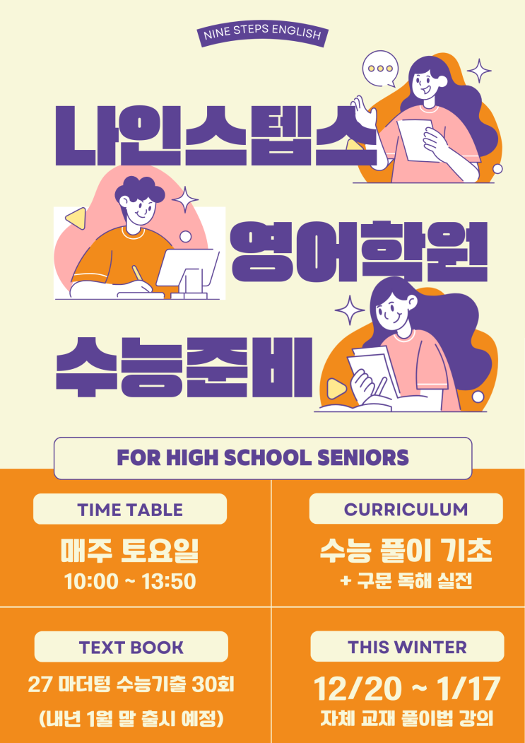 나인스텝스 주1회 수능반이 진행중에 있습니다. 대상은 전부 예비고3학생들로 열심히 전투적으로 수업중에 있습니다. *매주 토요일 오전 10:00 ~ 13:50 (주1회 4시간) *12/20 ~ 1/17 (5회차): 모의고사 풀이법 기초 강의-마더텅 교재 출시 전까지 학원 자체교재 사용 예정 *교재: 2027 마더텅 수능기출 30회 (1월 말 출시예정) 수능 영어, 기초부터 실전까지 한 번에 정리할 수 있는 수업이 진행되고 있습니다. 나인스텝스 영어학원 고3 영어 수능준비반은 문제 풀이의 기본 구조 이해 + 구문 독해 실전 적용에 초점을 맞추었습니다. 특히, 겨울 방학은 영어 실력을 구조적으로 다질 수 있는 가장 중요한 시기입니다. 고3 수능 영어, 방....... <img src="https://blogthumb.pstatic.net/MjAyNTEyMjBfMjc3/MDAxNzY2MTkzNjgwNDY0.aC0EAm2CcuLdjGdnjLbDOZ34PnL34yxt9IsgXsVLpO8g.ZbTaC0bzLRCihtdxFmkupQUBkQ-b9EBCJ1wOgWoM_DYg.PNG/KakaoTalk_20251220_094601090.png?type=s3" />