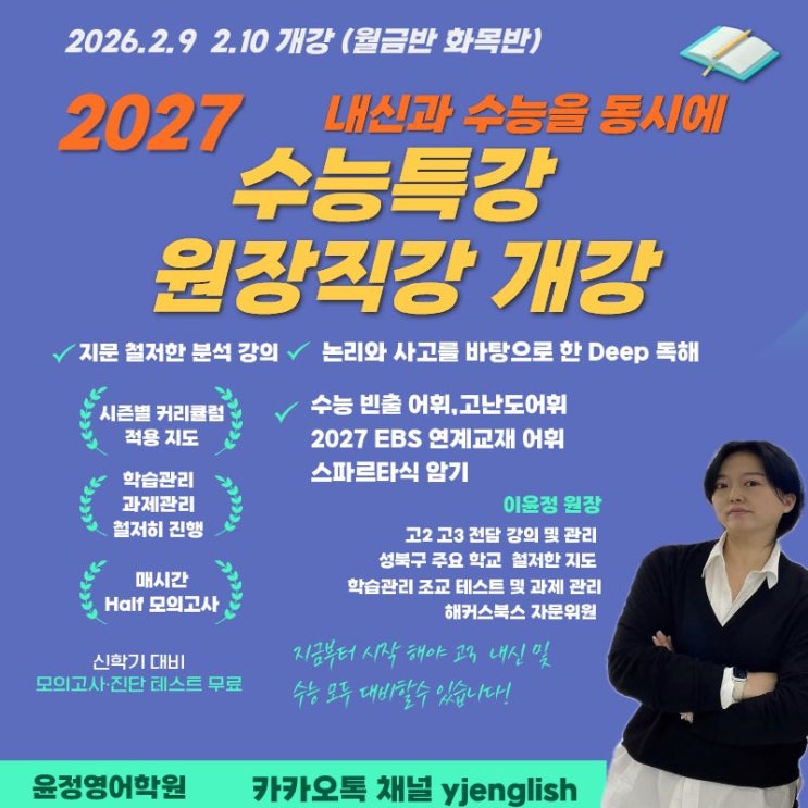 2027 수능 대비 원장직강 수능특강 개강 안내 윤정영어학원에서 내신과 수능을 동시에 준비하는 2027 수능 대비 원장직강 특강이 개강합니다. ✔ 지문 철저 분석 & 사고력 중심 독해 ✔ 수능 빈출·고난도 어휘 집중 학습 ✔ EBS 연계 어휘 & 스마트 암기법 ✔ 체계적인 커리큘럼과 철저한 학습 관리 ✔ 매시간 Half 모의고사 진행 개강일 – 2026년 2월 9일(월금반) – 2026년 2월 10일(화목반) 신학기 대비 모의고사·진단 테스트 무료 제공! 문의 윤정영어학원 카카오톡 채널: yjenglish http://pf.kakao.com/_zPWjs <img src="https://blogthumb.pstatic.net/MjAyNjAyMDNfMjg2/MDAxNzcwMDk1MjI5MTM5.FqtePisg6A1LruTFss8QaBtat4dOqWpgVVnwj0LyLhcg.p0NmXA8B2xieuzInj3J0m8NwY8sFnay72B_2doxwrLcg.JPEG/%C1%A6%B8%F1%C0%BB_%C0%D4%B7%C2%C7%D8%C1%D6%BC%BC%BF%E4._%2816%29.jpg?type=s3" />
