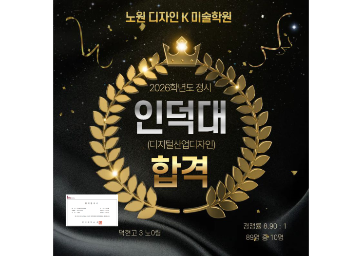 디자인K미술학원의 합격 신화는 올해도 계속됩니다! 현재 다양한 32주년 기념 이벤트가 진행 중입니다. K의 더 다양한 이야기가 궁금하시다면 방문 상담 연락 주세요^^ 카카오 채널 / 네이버톡톡 / 전화로 빠른 문의 가능합니다. ☎ 02-952-0624(5) 지하철 이용시 노원역 7호선 4번출구 생폴드방스 방면으로 2개 횡단보도 건너 왼쪽방향 노원역 4호선 2번출구 이니스프리 왼쪽방향 문화의 거리 직진 대로변 횡단보도 건너 오른쪽방향 1층 베스킨라빈스 및 미래팜약국 건물 8층입니다! 자가용 이용시 학원 뒷편으로 오시면 지상 및 지하주차장(B2,B3) 있습니다. 카카오 채널 ' 디자인K ' http://pf.kakao.com/_WAEFG 입시반 인스타 ( ˵....... <img src="https://blogthumb.pstatic.net/MjAyNjAyMjNfMjY4/MDAxNzcxODMyNDIyMTg5.uZPJKGpErrqHAd_z6sBdAmJ6-cMmpRVuc6V63tZeXO0g.CVJU2ottbDwNWG-Xzsex_ZBv-r6xnILz1_GROik5v0Ug.PNG/1.png?type=s3" />
