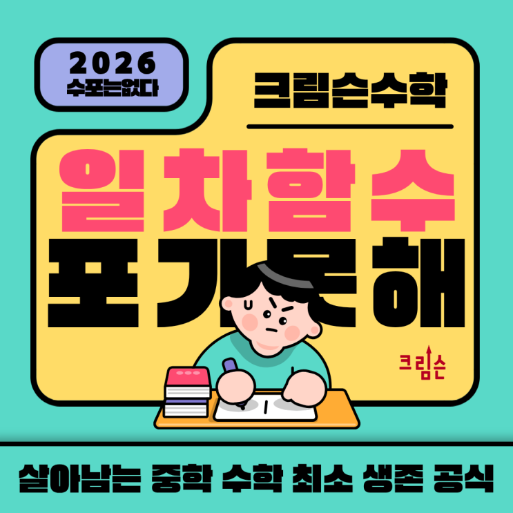 안녕하세요, 아산 용화동 크림슨학원입니다. 중2 수학에서 가장 많은 학생들이 포기하는 단원, 바로 일차함수입니다. "y = 2x + 3이 뭔 뜻이에요?" "그래프는 또 왜 그려요?" "기울기? 절편? 처음 듣는 말투성이예요." 일차함수는 새로운 용어도 많고, 그래프까지 나오니까 더 어렵게 느껴지죠. 하지만 일차함수는 딱 3가지만 알면 됩니다. 오늘은 수포자도 따라 할 수 있는 일차함수 최소 생존 공식을 알려드릴게요. 왜 일차함수에서 막힐까? 일차방정식까지는 "x를 구하라"였어요. 답이 하나 나오면 끝이었죠. 그런데 일차함수는 다릅니다. y = 2x + 3 x가 1이면 y는 5, x가 2면 y는 7, x가....... <img src="https://blogthumb.pstatic.net/MjAyNjAyMDdfMjQ2/MDAxNzcwNDIxNzIwMzk1.TCoeXpvatLpk2LGYcbFuh9HiSpQHnsZVXpoHnVDsPoIg.ccz-8KyuRkibsF_z_pAGWQ5QsoUD1cZM0CPL3lOnoBkg.PNG/%BC%F6%C6%F7%B1%DD%C1%F6_%281%29.png?type=s3" />