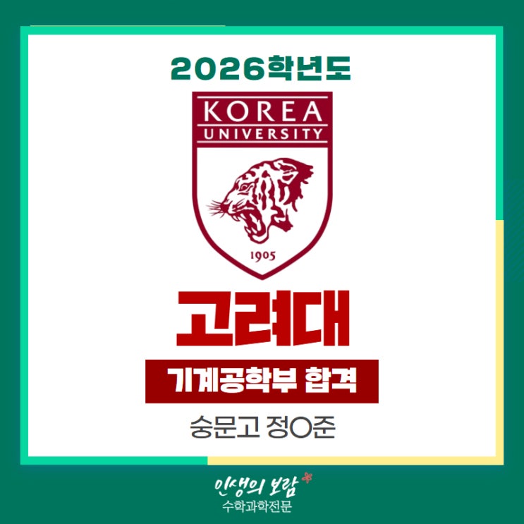 안녕하세요 인생의보람 수학과학 전문학원 본원입니다. 오늘은 고등학교 3년 동안 인생의보람에서 함께한 숭문고 정0준 학생의 고려대학교 기계공학부 합격 소식입니다! 26학년도 고려대학교 기계공학부는 약 17:1의 높은 경쟁률을 가지고 있었습니다. 숭문고는 이전 강북지역의 고등학교 인서울 진학률 1위를 달성할 정도로 교육 열의가 매우 뛰어난 학교입니다. 2022년 이후 자사고에서 사립 일반고로 전환하였음에도 자사고 못지않은 교육과정과 입결을 유지하고 있습니다. 정0준 학생 또한 인생의보람에 재원 하며 숭문고만의 내신 분석으로 화학과 생명 모두 1등급을 받아온 학생입니다! 학생 수도 적은 숭문고에서 어떻게 화학과 생명 두 과....... <img src="https://blogthumb.pstatic.net/MjAyNjAyMDlfMjg4/MDAxNzcwNjE0ODkwMTAw.dQg0-9KYkhxXcVRxkqizCmSLWRKgfhH3pjhYpdPz6kIg.aM66_spuYC5QPCeDm28R4YhIANjQADRoZafdioDevgMg.JPEG/2026_%C1%A4%C0%B2%C1%D8_%B0%ED%B7%C1%B4%EB.jpg?type=s3" />