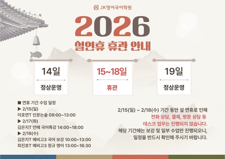 안녕하세요. JK고등관입니다. 2026년 2월 설 연휴를 맞아 고등관 휴강 및 수업 일정에 대해 안내드립니다. 아래 일정을 참고하시어 수업 참여에 차질 없으시기 바랍니다. 2/15(일)~2/18(수) 기간은 설 연휴로 인해 전화 상담 및 방문 상담, 결제 등 데스크 업무는 진행되지 않습니다. 해당 기간에는 보강 및 일부 수업만 진행되오니, 일정을 반드시 확인해 주시기 바랍니다. ▶ 2/15(일) 이호연T 인문논술 오전 9-1 ▶ 2/16(월) 모든 수업 휴강 ▶ 2/17(화) 김은지T 언매 국어특강 오후 2-6 ▶ 2/18(수) 김은지T 예비고3 국어 보강 오전 10-1 최진호T 예비고3 정규 영어 오후 1-4:30 2/19(목)부터는 모든 수업이 정상 진행되며, 데스크 또한 정상....... <img src="https://blogthumb.pstatic.net/MjAyNjAyMTNfMTUw/MDAxNzcwOTY5NTkzMDE0.bib-GUPzYzOF22gtmFSqGywFiEK2kQsJQ0JT6unW_lkg.-Xcdb5TTiZ5gdes2HCQ1rGcQR6W-ijwKE283rUN5kusg.JPEG/%BC%B3_%C8%DE%B0%FC_%BE%C8%B3%BB%B9%AE.jpg?type=s3" />