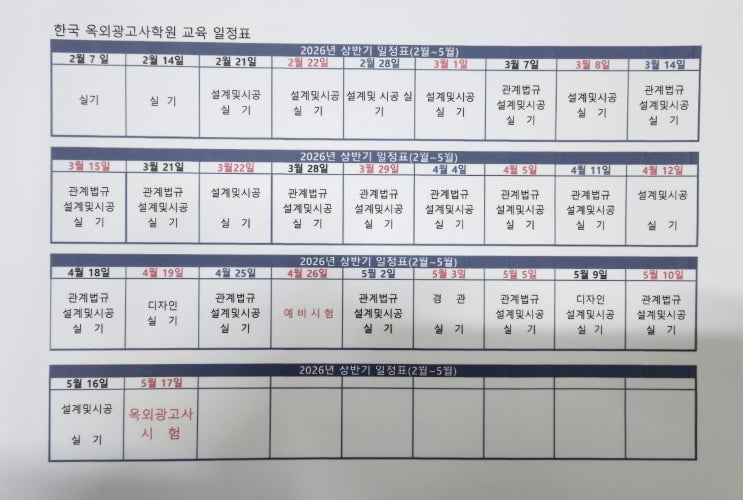 2026년 옥외광고사 시험대비 학원 일정표-매주 수시개강