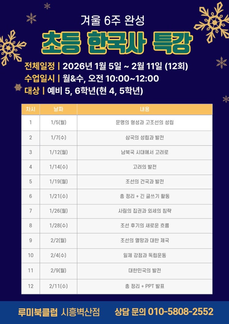 안녕하세요, 루미북클럽의 김쌤입니다 ^^ 생각보다 많은 학생들이 역사를 어려워합니다. 외워야 할 게 많다고 생각하면 시작부터 부담이 되는데요, 초등 한국사 공부의 핵심은 암기보다 흐름을 잡는 것에 있습니다. 한국사는 그냥 연도와 사건의 나열이 아니라, 시간의 흐름 속에서 사회가 변화한 이야기이기 때문입니다. 예를 들어, 조선 시대에 대해 외우기 보다 고려가 왜 망했고 조선이 왜 생겼는가를 이해하는 것이 중요합니다. 이렇게 사건의 원인과 결과를 연결해야 다음 시대의 흐름도 자연스럽게 이어집니다. 1️⃣ 한국사는 이야기의 순서를 잡는 공부이니 만큼, 흐름 이해 중심으로 수업하며 핵심 용어 및 개념을 정리, 서술형 대비까....... <img src="https://blogthumb.pstatic.net/MjAyNTEyMTRfMTQ3/MDAxNzY1NzAyNDU4MTQ4.6QSSo6onTpHgEon9FKsw1HAl0P79ubAUfsp3n20g1hAg.5qx8PUsUadhI7DNVAM3nbOwq96AuhkZRlkXbxWMgqQMg.JPEG/%C1%A6%B8%F1%C0%BB_%C0%D4%B7%C2%C7%D8%C1%D6%BC%BC%BF%E4._%281%29.jpg?type=s3" />