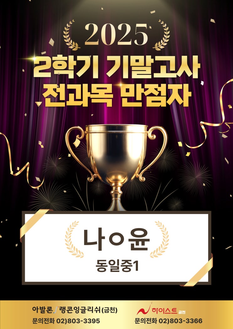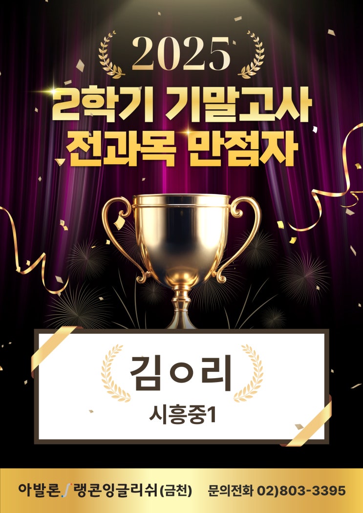 [아발론, 랭콘 금천] 2025 2학기 기말고사 전과목 만점자!