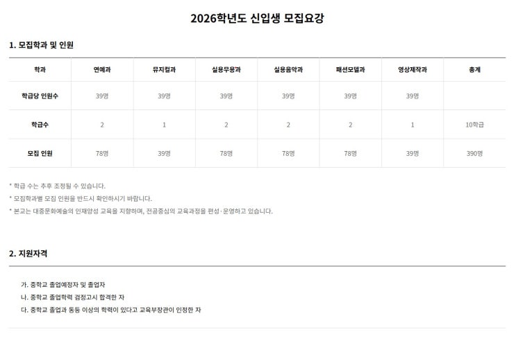 안녕하세요 뉴즈댄스학원 입니다. 오늘은 예고 입시요강에 대해 한번 알아볼까요? 2026학년도 모집요강을 참고하여 연예과, 실용무용과, 실용음악과 2027학년도 준비에 도움이 될 수 있도록 정리해 보았습니다. 한림예고 입시요강 한림예고는 실기 100% 반영이며 아래에는 각 과별 전형방법 입니다. ⭐여기서 중요한 점⭐ *화장금지, 피어싱금지, 타투금지 *MR은 학생본인의 USB에 mp3 또는 wma 파일로 담아 제출 모든과의 공통사항입니다. 서울공연예고 입시요강 서울공연예고는 중학교 성적이 같이 반영되는데요 교과점수, 출결점수 그리고 실기 점수까지 적용됩니다. 학교별로 다르게 반영되기 때문에 본인이 원하는 학교에 맞게 준비하는게 좋....... <img src="https://blogthumb.pstatic.net/MjAyNjAyMjRfNDkg/MDAxNzcxOTE5NzYwNTgz.P7TZa-ZXxlDlJRpAKCxS5qqmnieDOXokmlwVsHb3m6og.O6jL_7w4F41TDXVf5jEy8D0P2wmwLSswiZ3Plg4ILVAg.JPEG/%C8%AD%B8%E9_%C4%B8%C3%B3_2026-02-24_165321.jpg?type=s3" />