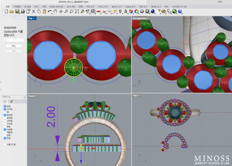 단면이 오각형 형태인 반지 링을 먼저 만들어볼게요! 내경을 중심으로 right 뷰에서 반지 단면을 커브로 그려줍니다. 그리고 레일1 을 사용하면 준비 끝! 본격적으로 스톤 세팅에 들어가 볼게요~ 중앙의 메인 다이아를 중심으로 이렇게 꽃처럼 둘러싸여 있게 만들러 면 회전을 사용해 주면 됩니다 그럼 이제 오늘 디자인의 핵심! 물방울 모양의 다리를 만들어 세팅해 볼 차례! 그려둔 커브에 파이프를 사용해 형태를 잡아주고 반대쪽은 '미러 복사'로 빠르게! 반지 같은 경우 세팅을 할 때 바로 개체에 스톤을 얹지 않고 커브 따라 흐름 또는 서피스 따라 흐름을 활용해 스톤을 세팅합니다 휘어진 곡률 때문에 난발이 제대로 물리지 않....... <img src="https://blogthumb.pstatic.net/MjAyNjAzMTZfMTEg/MDAxNzczNjQ1NDk0NjI1.8Dok7rPmNGxVlrzdhp4gs2QsJ8WXdMnf9ZnaXFNWxOUg.-Qbps4oIyJRH_Ei7_EJD5k6SsluGnJOES_abK32M5y0g.PNG/image.png?type=s3" />