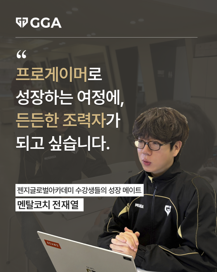 안녕하세요. 젠지글로벌아카데미입니다. '게임과 멘탈코칭' 생소하신 분들이 많으실텐데요! 오늘은 발로란트, 롤 프로게이머로 성장하는 여정에, 든든한 조력자가 되고 싶다고 이야기하는 젠지 공식 게임 교육 전문 아카데미의 전재열 멘탈코치님을 만나보았습니다! 자기소개 부탁드립니다. 안녕하세요. 젠지글로벌아카데미(GGA)에서 멘탈코치로 활동하며, 종합반 국내반 부담임을 맡고 있는 전재열입니다. 학생들이 자기만의 올바른 게임 루틴을 만들 수 있도록 돕고, 멘탈코칭과 상담을 함께 진행하고 있습니다. e스포츠로 오시게 되셨는데, 특별한 이유가 있을 것 같아요! 청소년 상담 현장에서 아이들이 게임을 대하는 건강한 태도....... <img src="https://blogthumb.pstatic.net/MjAyNjAzMThfNzYg/MDAxNzczODAwNjEwNzQ1.Jz4AcKMdXnHiwDLdd2fJ4swD-N6-aLqiXYdRbeAKUccg.mp-ebTj_7007Ql9Sp8wx6Ppg0uRovVnaNRqW8DlB4iMg.PNG/%C0%FA%B8%AE%B4%D4_%C0%CE%C5%CD%BA%E41.png?type=s3" />