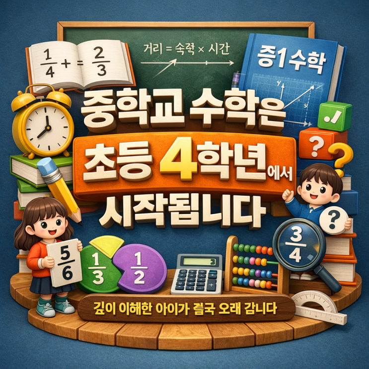 중학교에 올라가면 수학이 갑자기 어려워질까 봐 걱정하는 분들이 많습니다. 하지만 실제로 격차가 벌어지는 시점은 조금 더 이릅니다. 대부분 초등 4학년에서 시작됩니다. 3학년까지의 수학은 계산 중심입니다. 빠르고 정확하게 풀 수 있으면 비교적 안정적입니다. 그러나 4학년부터는 기준이 달라집니다. 이제는 “왜 그렇게 푸는지” 가 중요해집니다. 4학년에서는 분수의 개념이 본격적으로 등장하고, 약수와 배수, 규칙 찾기처럼 ‘관계’를 이해해야 하는 단원이 시작됩니다. 공식을 적용하는 것만으로는 버티기 어려워집니다. 분수 덧셈을 예로 들어보겠습니다. 통분을 왜 하는지 설명할 수 있는 아이와 공식처럼 적용하는 아이는 6학년이....... <img src="https://blogthumb.pstatic.net/MjAyNjAyMTJfMjgx/MDAxNzcwODczMjIzNjky.xvomY8F2G2KwPvaKzSPSOsW3dm0Z4HbR_LjgpdvclSEg.-UcsJnjP1M-9C2Tf8-JHAVxcDicYkS2ycUI4yb1U-pAg.PNG/ChatGPT_Image_2026%B3%E2_2%BF%F9_12%C0%CF_%BF%C0%C8%C4_02_10_47.png?type=s3" />