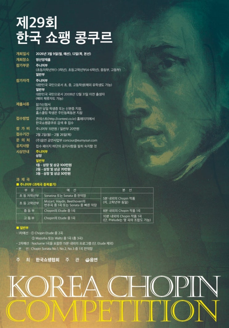 제 29회 쇼팽콩쿨 예선 통과 이재희(옥곡초6) 연세피아노 스튜디오의 옥곡초등학교 6학년 이재희 학생이 제29회 한국 쇼팽 콩쿠르 예선을 통과해 본선에 진출하게 되었습니다. 한국 쇼팽 콩쿠르는 월간 『음악춘추』를 발행하는 클래식 음악 전문 기관 ‘음연’이 주최하는 콩쿠르로, 오랜 기간 이어져 온 국내 메이저 콩쿠르 가운데 하나입니다. 전국의 많은 피아노 전공 학생들이 참여하는 무대로, 쇼팽 작품을 중심으로 음악성과 해석을 함께 평가하는 콩쿠르로 알려져 있습니다. 재희 학생도 이번 콩쿠르를 준비하며 곡을 차근차근 정리하고 무대 경험을 쌓는 시간을 가졌습니다. 그 과정 속에서 예선을 통과해 본선 무대에 오르게 되었습니....... <img src="https://blogthumb.pstatic.net/MjAyNjAzMTBfMTA4/MDAxNzczMTA5OTE0ODk4.OdQcltNsHDCzEs4S7VEsO3OJY_8VmeUaM00YgAZ_Deog.9Rto7KF8jmB1OdKmueKT3SlF9KzGM9xFKHYe4xfzJYAg.JPEG/IMG%A3%DF2040.JPG?type=s3" />
