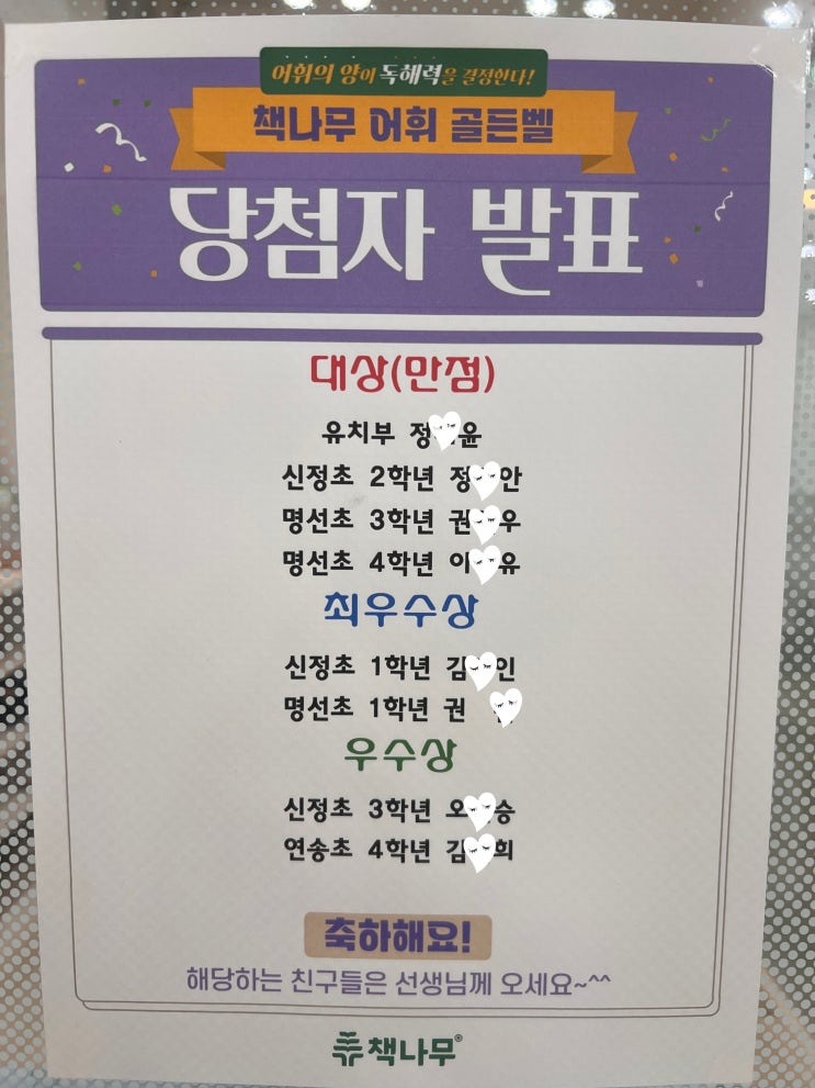 안녕하세요. 책나무 송도점입니다. 아이들이 겨울방학 동안 준비했던 어휘 골든벨의 결과를 공개하였는데요. 이번에 아이들이 등원하면 바로 확인할 수 있도록 교실 문에 결과표를 붙여 두었는데요. 아이들은 등원하며 문 앞에 옹기종기 모여 자신의 이름을 찾아보았어요. 이름이 있는 아이들은 환하게 웃었고, 아쉽게 이름을 찾지 못한 아이들도 있었습니다. “조금만 더 맞출 걸…” “그 단어를 알았는데…” 아쉬워하는 모습도 적지 않았습니다. 하지만 그 아쉬움은 그만큼 진지하게 준비했고, 끝까지 최선을 다했다는 증거이기도 합니다. 이번 시상의 주인공인 친구들도 한 번 만나 보아요 아이들이 정말 가지고 싶어했던 이번 상품은 바로....... <img src="https://blogthumb.pstatic.net/MjAyNjAyMjBfMjQw/MDAxNzcxNTY3NzY3ODA1.ghPJc3eb5usS9FdBxDjTC0yIJED8LAMbpm7YE7ZV6dwg.vNG7_bi73xejWNsH2GOk4UBnc2GSSm-KwMNz-qVCyBEg.JPEG/KakaoTalk_20260220_144440837.jpg?type=s3" />