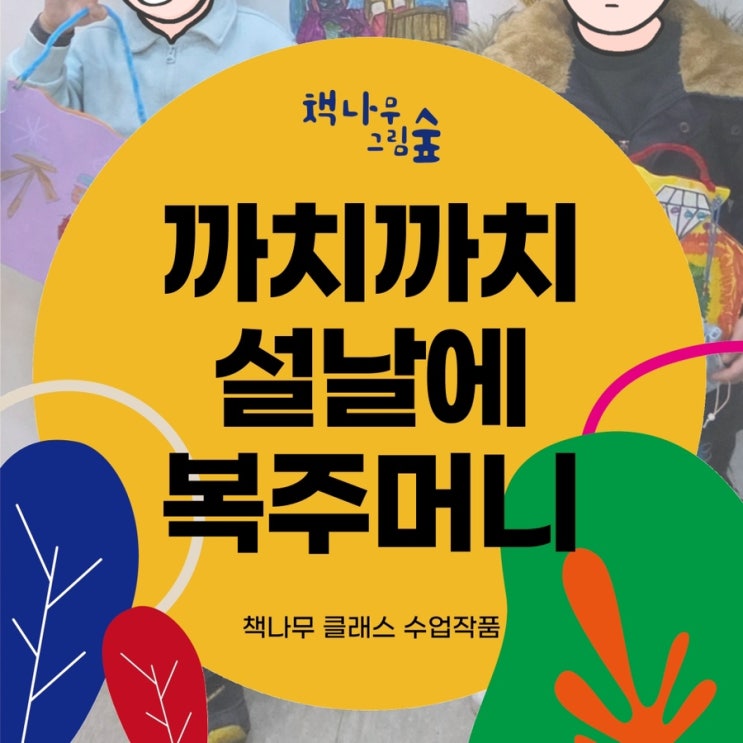 설날 복주머니 제작 및 과정 수업 안녕하세요~ 송도아동미술 책나무그림숲이에요^^ 여러분 ‘까치 까치~’ 하면 다음에 생각나는 노래 가사가 무엇인가요? 바로 ‘설날’인데요! 사실 노래에서 나오는 까치는 동물인 ‘까치’가 아니라고 해요. 까치 설날에서 까치는 ‘작은’ 을 뜻해서 까치 설날이 ‘작은 설날’이라고 하네요! 그래서 ‘까치 까치 설날은 어저께고요.’ 라는 가사가 생겼다고 하네요! 오늘은 송도아동미술 책나무그림숲에서 설날에 맞는 재밌는 수업을 함께 진행했는데요. 아동미술반인 책나무클래스에서 다같이 무슨 수업을 했는지 보도록 할까요! ✏️도서 소개✏️ 송도아동미술 책나무그림숲에서 사용한 도서는 바로 [설....... <img src="https://blogthumb.pstatic.net/MjAyNjAyMjBfNzIg/MDAxNzcxNTk1MjYxNTU0.3P0ikchvAjW5dNYpPZdhxCbEBD4hamzY6foTGG7kniAg.ldfv467Mwa_NHy6uhY8zaysa2CkKc1iOZ5ySplD7nyMg.JPEG/%BA%ED%B7%CE%B1%D7_%BD%E6%B3%D7%C0%CF_%B1%E2%BA%BB.jpg?type=s3" />
