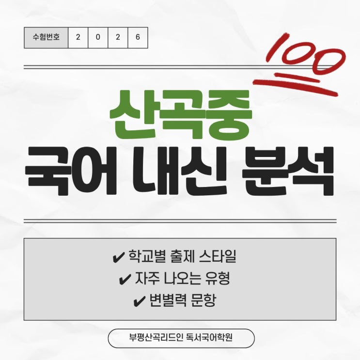 산곡중 국어, ‘적용력’이 성적을 가르는 시험입니다 “시험은 결국 운 아닌가요?” 산곡중 국어 시험은 그런 유형의 시험이 아닙니다. 산곡중 시험은 공부한 만큼 결과가 나오는 시험에 가깝습니다. 오늘은 산곡중 국어 내신의 특징과 대비 전략을 정리해 보겠습니다. 1️⃣ 균형있는 시험 난이도 산곡중 국어 시험은 너무 쉬운 문제만 있는 시험도 아니고, 반대로 몇 문제만 지나치게 어렵게 나오는 시험도 아닙니다. 대신 ✔ 기본 개념을 확인하는 문제 ✔ 이해를 묻는 문제 ✔ 적용력을 보는 문제 균형 있게 출제되는 편입니다. 그래서 시험 결과도 비교적 명확합니다. 대충 공부한 학생과 제대로 준비한 학생의 점수 차이가 분명하게....... <img src="https://blogthumb.pstatic.net/MjAyNjAzMTJfMTk1/MDAxNzczMjg3NTg1MDA0.0d307JomZ8_K_-lJUZUmIitIoXdqRulTGb0b7ttIg8Ig.HJCKt9PCVrfHf9SiiY_mWz1ZafQ8jdefQ3CvDiCof8Ig.JPEG/1.jpg?type=s3" />