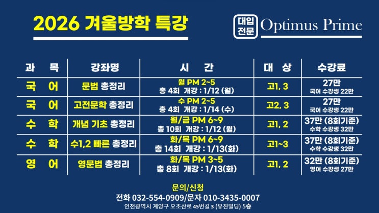겨울방학을 맞이 하여 옵티머스 프라임 학원에서는 '총정리 특강 시리즈' 를 마련하였습니다. 모든 과목에 대한 이해와 공부에서 가장 효과적인 것은 하나의 파트를 처음부터 끝까지 단기간에 한 번 완성하는 것입니다. 물론 속도에만 치우치지 않기 위해 저희 학원은 지금도 특강에 대한 마무리 준비 단계를 계속해서 해 나가고 있습니다. 1. 국어 1) 문법특강 국어 문법은 이제 피할 수 없는 영역이 되었습니다. 수능에서도 필수적으로 요구되기 때문입니다. 또한 고1, 2 내신에서 문법이 시험범위에 포함이 됩니다. 대부분의 학생들이 자신 없는 고등 국어 문법을 단 4번의 수업으로 기초부터 수능레벨의 문제까지 풀이할 수 있게 하....... <img src="https://blogthumb.pstatic.net/MjAyNTEyMTVfNjYg/MDAxNzY1ODAxNjI5Mzky.2SYeGyqUbR-TAb06nsVQoai0Ng-aJBmTCNkNwC4ubFsg.jxXySjALfL3w_BwwcT9l0IZpoRb9B13zYoZPstTFpfkg.JPEG/26%C6%AF%B0%AD%BE%C8%B3%BB%B9%AB.jpg?type=s3" />