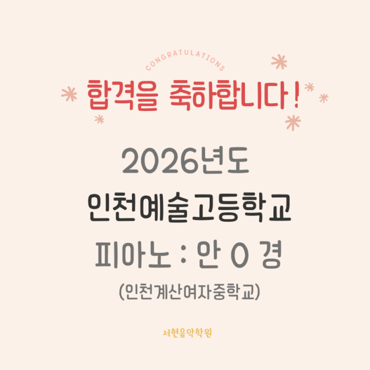 안녕하세요 작전동피아노입시학원 서현음악학원입니다 2025년도 합격소식을 전하려합니다♡ 2026년도 인천예술고등학교 피아노과 합격 축하합니다 ! 입시반에 들어온지 1년만에 합격소식이라니 너무대견합니다 ! 2026년도에도 좋은 소식가득하길바랍니다 축하합니다 상담문의032 552 8111 #작전동피아노학원 #작전동피아노입시 #계양구피아노입시 #작전동음악학원 #서운동피아노학원 #작전동바이올린 #계산동피아노 #계산동피아노입시 #인천예술고등학교 <img src="https://blogthumb.pstatic.net/MjAyNTEyMTZfMTEx/MDAxNzY1ODU3NjU3Mjg3.9r7mRTzOhteszFl9imIBoK05Q80HoKlE6LMiIyVT5OMg.8MOvVp29OSkglgC8rv4cWB59YSGXMg9fvWIsNcBSqhUg.PNG/900%A3%DF1765857502265.png?type=s3" />