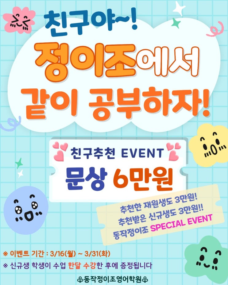 학부모님 안녕하세요, 영어의 시작과 완성! 내신영어와 수능영어의 끝판왕!! 동작 정이조 영어학원입니다~ 3월 신학기도 이제 2주차가 끝나가고 있습니다. 저마다의 방법과 속도로 점차 학원 수업과 과제들에 익숙해지고 있는데요, 우리 아이들이 더 즐겁게 공부하고, 함께 성장하는 기쁨을 누릴 수 있도록 아주 특별한 이벤트를 준비했습니다~ 혼자보다 둘이, 둘보다 여럿이 하면 더 힘이 나는 영어 공부! 친구들과 함께 하면 기쁨도 두배! 선물도 두배!! 《동작 정이조 영어학원 - 친구추천 SPECIAL EVENT》 이벤트 기간 : 3월 16일(월) ~ 3월 31일(화) 문화상품권 6만원 증정 이벤트!! 추천받은 신규생 : 문화상품권 3만원 증정 추....... <img src="https://blogthumb.pstatic.net/MjAyNjAzMTJfMTE0/MDAxNzczMzA0MjU0NjU0.TdzICjt2eMLj8qY_OVJpFG8so63QScMOjT8fUyvACpQg.vuu-IKBC1ZgGmosRc1g4Sj2wUOzmmzpbUiuoEYKKLTwg.JPEG/%C1%A6%B8%F1%C0%BB_%C0%D4%B7%C2%C7%D8%C1%D6%BC%BC%BF%E4._%287%29.jpg?type=s3" />