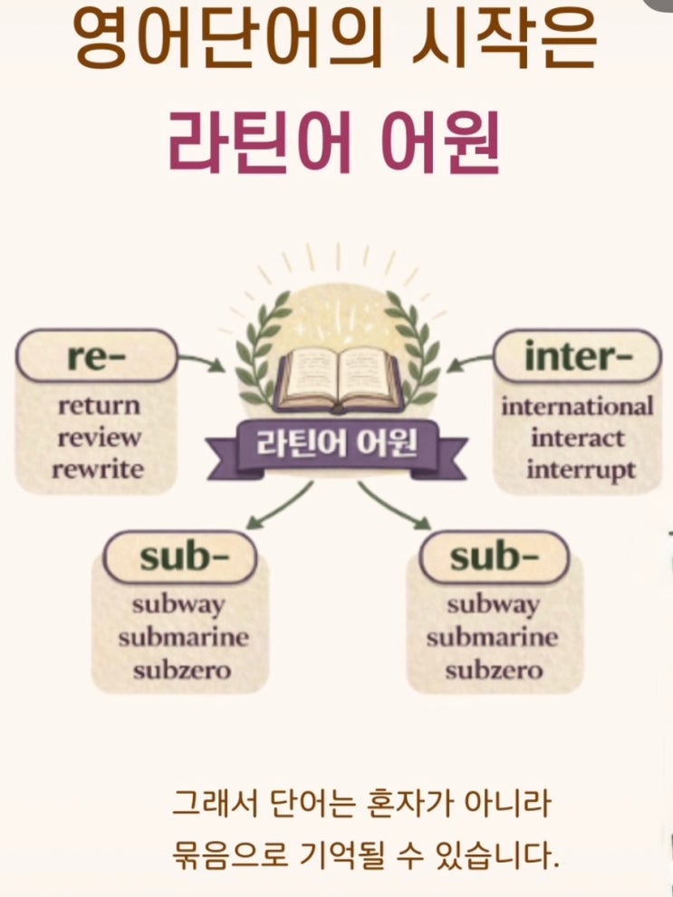 영어단어 아무리 외워도 안 외워질 때? 영어단어 잘 외우는 법 (라틴어 어원으로 해결!) 하루에 영어단어 10개씩 외우는데 다음 날이면 절반은 사라지는 경험, 다들 있으시죠? “이 단어… 분명 어디서 봤는데?” 그런데 막상 시험 보면 생각이 안 납니다. 왜 그럴까요? ⸻ 영어단어가 기억에 안 남는 이유 많은 학생들이 영어단어 암기법을 ‘한 단어씩 따로’ 외우는 방식으로 합니다. 하지만 영어단어는 ✔ 혼자가 아니라 ✔ 서로 연결된 구조로 만들어져 있습니다. 즉, 연결 없이 암기하면 단기기억으로 끝나버리는 거죠. ⸻ 영어단어 오래 기억하는 법 핵심은 “앞부분(접두사)”을 먼저 보는 것 영어단어의 시작은 라틴어 어원입....... <img src="https://blogthumb.pstatic.net/MjAyNjAyMThfMTUz/MDAxNzcxMzgwNTkzNTQ2.4YQVjRV8PtjeEGr393vMZnRdXyJaMnuaATichKle3BYg.ko74vG3CPEc-EUSntJZXVa4UgXbIekFbwRk-eKr3h80g.JPEG/IMG%A3%DF0683.jpg?type=s3" />