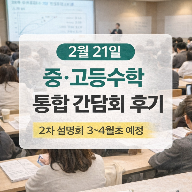2월 21일 중·고등수학 통합 간담회 후기 지난 2월 21일(토), 수준영재수학에서 진행한 중·고등수학 통합 간담회가 많은 관심 속에 마무리되었습니다. 이번 간담회는 예약 신청을 받은 당일에 정원이 모두 마감될 정도로 중등·고등 수학에 대한 학부모님들의 관심과 고민이 얼마나 큰지 다시 한 번 느끼게 한 자리였습니다. 정원이 빠르게 차면서 이후에는 대기 접수로 전환되었고, 아쉽게도 대기자 중 상당수는 당일 취소 인원이 예상보다 적어 실제 참석이 어려웠습니다. 그만큼 이번 주제에 대한 수요가 높았고, “한 번쯤은 꼭 들어보고 싶었다”는 문의가 계속 이어졌습니다. 이번 간담회에서는 중등수학과 고등수학을 분리해서 보는 것이 아....... <img src="https://blogthumb.pstatic.net/MjAyNjAyMjNfMjAx/MDAxNzcxODE2MzM5MzU5.cuTXkp5YKYSg1yPv2d3tAdvyfBikkwYMkyrNH6FG1HIg.RgLe189EvEiNx3ZlkrmCctq1l2m1e8sc_3EEBYccVfcg.PNG/ChatGPT_Image_2026%B3%E2_2%BF%F9_23%C0%CF_%BF%C0%C8%C4_12_10_42.png?type=s3" />