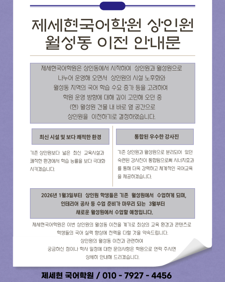 기존 상인원이 현 월성원 바로 옆 (구. 트랩코리아 방탈출 카페)으로 확장 이전합니다. 최신 시설이 갖추어진 보다 쾌적한 환경에서 통합된 우수한 강사진이 시너지효과를 통해 더욱 체계적인 국어교육을 제공하겠습니다. <img src="https://blogthumb.pstatic.net/MjAyNjAyMjFfMTgg/MDAxNzcxNjc0OTUwMjMz.mdOz50HmBWJ1_1JxtpCN6xrg6xwV-K_4X0k45WRXQXAg.00recKBp32ka0PI2VbQskIz-_6cM-UQs4n7yHC2nrRog.PNG/%BB%F3%C0%CE%BF%F8%C0%CC%C0%FC%BE%C8%B3%BB%B9%AE.png?type=s3" />