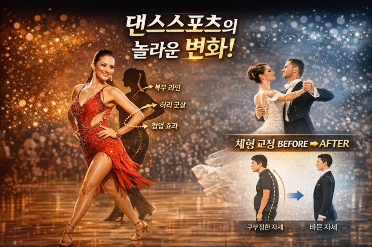 댄스스포츠 효과, 왜 이렇게 반응이 좋을까요? 1️⃣ 다이어트 효과가 빠릅니다 ✔ 1시간 500~700kcal 소모 ✔ 복부, 허리, 힙라인 집중 정리 ✔ 군살 정리 + 탄력 증가 지루하지 않아서 “운동해야지”가 아니라 “오늘 수업 언제지?”가 됩니다. 2️⃣ 자세 교정 효과가 확실합니다 댄스스포츠는 기본이 바른 자세입니다. ✔ 굽은 어깨 개선 ✔ 거북목 완화 ✔ 허리 라인 정리 ✔ 걸음걸이 교정 3개월 후에는 몸무게보다 먼저 이미지가 달라집니다. 3️⃣ 40대·50대·60대에게 특히 좋은 이유 ✔ 관절에 무리 없는 전신운동 ✔ 두뇌 자극 → 치매 예방 도움 ✔ 갱년기 우울감 완화 ✔ 스트레스 해소 실제로 수강생분들 말씀: “몸이 가벼워....... <img src="https://blogthumb.pstatic.net/MjAyNjAyMjJfMjQw/MDAxNzcxNzEzMzY5MDkz.Kw-qDptbnVD16MiP-8U0w789RJH1qlP6xCscV0gMbtUg.wsiGYj-AtAiXm5fTfw8vncvTVEZeeIvvbeXGMKHdV4Yg.JPEG/82BFED2F%A3%AD0468%A3%AD4AF5%A3%AD9D43%A3%ADF4B4782317D4.jpg?type=s3" />