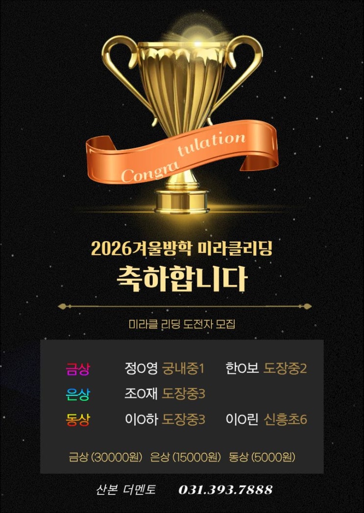산본 더멘토 2026학년도 겨울방학 미라클리딩 특별상 수상을 축하합니다.