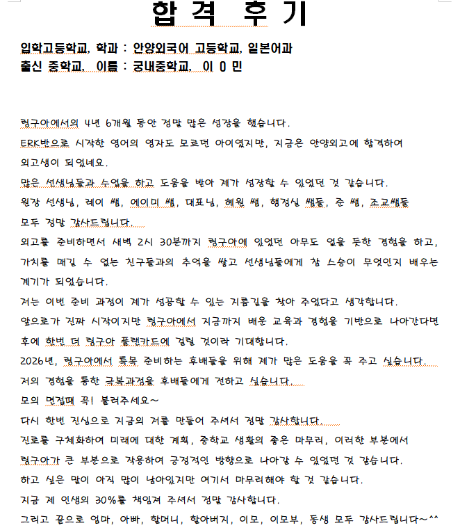 2026학년도 링구아 특목고 합격 후기