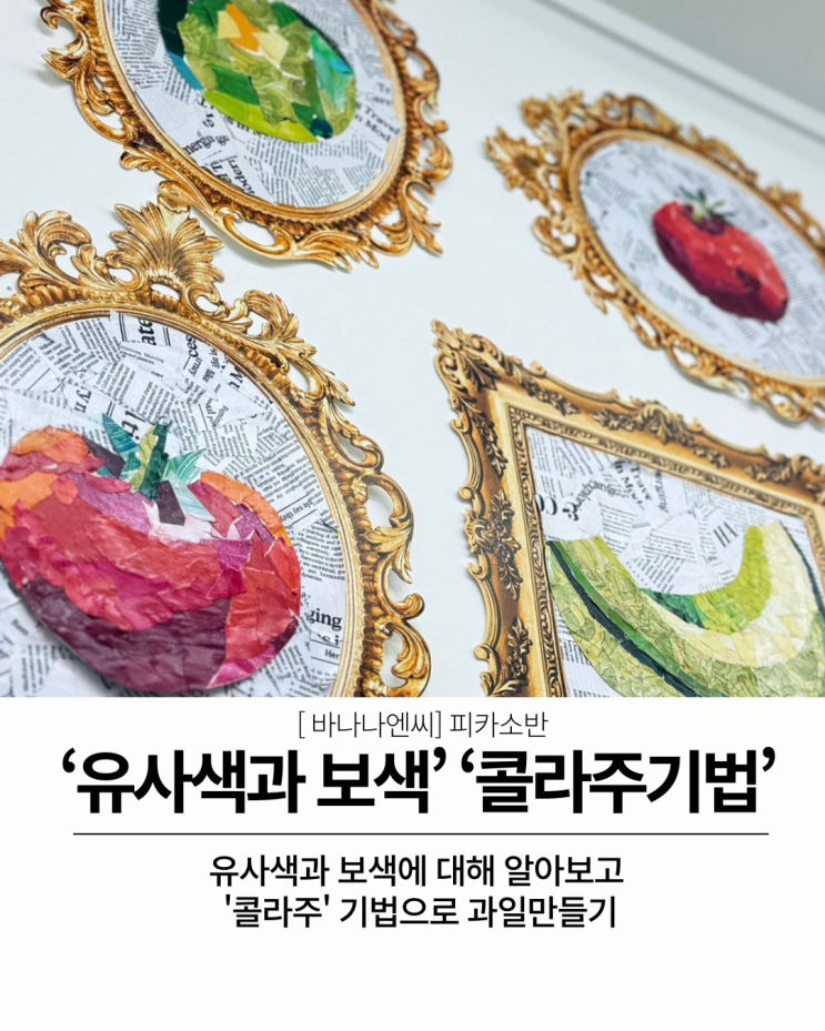 안녕하세요~ 군포 산본 미술학원! 초등 전문 미술학원! 산본 바나나엔씨 미술학원 피카소반의 수현T입니다 겨울방학이 지나가고 새학기가 시작되었는데요! 우리 피카소반 친구들도 오랜만에 등교를 하고 새로운 환경에 적응을 하며 한 단계 더 성장을 하기 위한 도약을 시작했답니다! 사랑스럽고 기특한 피카소반 친구들은 지난 달 어떤 수업을 진행했을까요? 바로 유사색과 보색에 대해 알아보고 '콜라주' 기법으로 과일을 만들어보았답니다 과일은 숙성의 과정을 거치면서 많은 색깔들이 나타나는데요 아이들이 과일을 관찰하면서 보다 정확하고 많은 색을 발견하고 비교 할 수 있도록 기본 색상환을 먼저 채색....... <img src="https://blogthumb.pstatic.net/MjAyNjAzMTdfMjUz/MDAxNzczNzM1NTk0Njk3.4tXgvXzyPmlpqMznTIBCfoEHDUqKIZ1tpsljMcSoQsYg.98hy9-OwhLmVyBFItvSOJ5jcFVzLLe6QbltWxUoqOJ0g.PNG/%B0%CB%C1%A4%BB%F6_%BD%C9%C7%C3%C7%D1_%C1%A6%C1%D6%B5%B5_%BF%A9%C7%E0_%C3%DF%C3%B5_%C0%CE%BD%BA%C5%B8%B1%D7%B7%A5_%B0%D4%BD%C3%B9%B0_%2812%29.png?type=s3" />