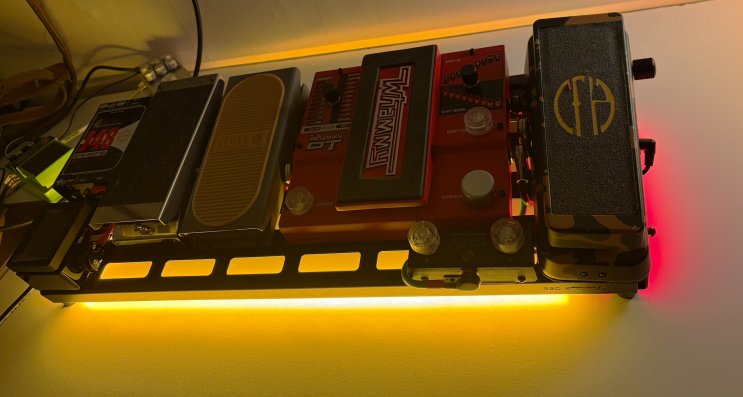 일렉기타 페달보드에 이렇게 LED 스트랩까지 작업해보겠다. 지난편까지 설치를 다하고 보니 이제 DC 포트가 하나 남았다. 이곳은 초콜릿의 전원을 연결하려고 했는데 겸사겸사 반짝반짝하게 꾸며줄 led 스트립 전원으로도 사용할 것이다. dc 케이블 한쪽은 5v컨버터를 연결해야하니 케이블 커넥터를 납땜해서 하나 만들었다. 반대쪽은 오른쪽 사진의 컨버터에 연결했다. LDE 스트랩과 초콜렛의 전원은 5v이기 때문에 9v를 5v로 바꿔주는 컨버터를 이용해야한다. 커넥터를 마지막 5번째 자리에 꽂아주고 마운트와 스트랩으로 케이블을 잘 정리해서 컨버터의 자리를 잡는다. 컨버터에 알리에서 주문한 LED 스트랩을 연결해서 전원이 잘 들어오는지....... <img src="https://blogthumb.pstatic.net/MjAyNjAyMjJfMTQx/MDAxNzcxNzYzNzgwMjU5.ZgLyD6Mn8enObCdL3allN42co14t9hT49sgRWlE_Q58g.1-_KaDTrvad9CAhHsnpJKsFozYuHP7YXxDWUJx9iIsgg.PNG/%BD%BA%C5%A9%B8%B0%BC%A6_2026-02-22_%BF%C0%C8%C4_9.22.25.png?type=s3" />