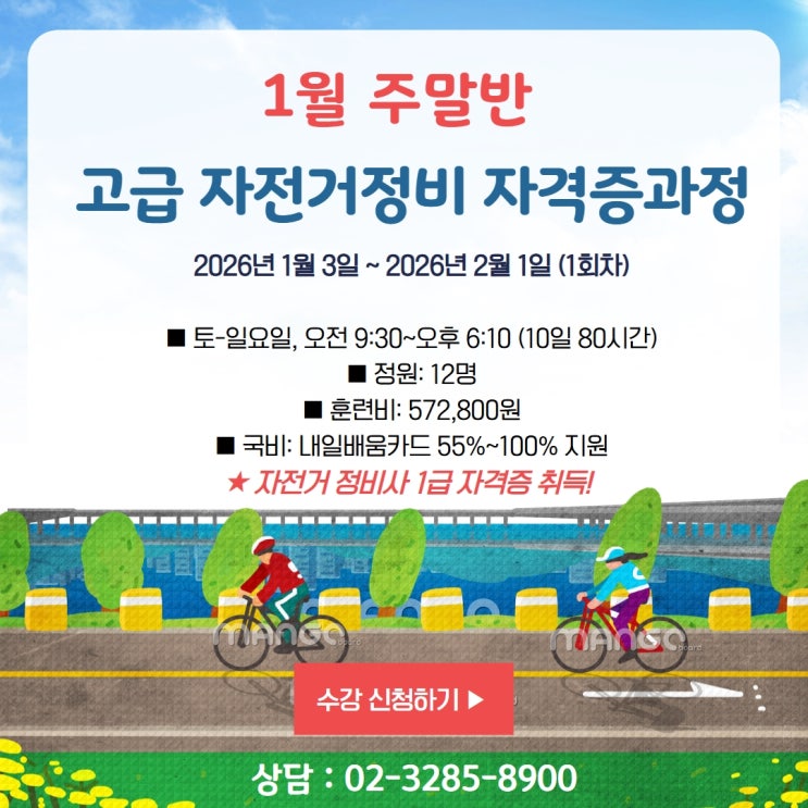 안녕하세요, 서울 동작구 상도동에 위치한 한국 자전거정비 기술학원입니다. 저희 학원의 2026년 새해, 1월의 자전거 정비수업 일정에 대해 안내해 드리겠습니다. (수업 안내 포스터를 클릭하시면 바로 수강신청이 가능한 페이지로 넘어갑니다.) 먼저 평일에 시간 내시기 힘든 분들을 위한 과정으로, 주말을 활용하여 자전거 정비를 배우고 자전거 정비사 자격증까지 도전하실 수 있는 주말반입니다. 자신이 타고 있는 고급 자전거에 대해 자가 정비 능력을 향상시키고 싶으신 분들께도 추천드립니다. 다음은 평일 7일 동안 진행하는 폐자전거 리사이클 정비 과정입니다. 생활자전거 정비 기술을 배우고 상태가 안 좋은 자전거들을 어떻게 손볼 수....... <img src="https://blogthumb.pstatic.net/MjAyNTEyMTlfODEg/MDAxNzY2MTIzMDQwMjI1.Tpq92vs6ynoj5wmxQ9O4_hvBB8rv9CO1ikRk_sVjgAIg.2pZVKhz6W6GlSFUb5z00vGreQk8HPq_eqfqp56H7KoUg.JPEG/26%B3%E2_%C1%D6%B8%BB%B0%FA%C1%A4.jpg?type=s3" />