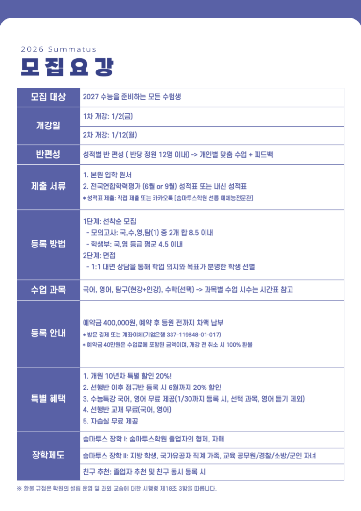 안녕하세요. 예체능 입시를 위한 최선의 선택! 숨마투스학원 선릉 예체능 전문관입니다. 2027년도 수능을 준비하는 수험생들을 위해, 2026년 1월 2일 (금)에 개강하게 될 숨마투스 2026 선행반 모집 소식을 알려드립니다. 먼저 숨마투스학원은 선릉에 위치한 예체능 전문 종합 학원으로, 소수 정예로 운영되어 입시를 앞둔 학생들이 흔들림 없이 목표에 집중할 수 있는 환경을 제공합니다. 2027년도 수능을 준비하는 모든 학생들을 대상으로, 개인의 성적과 학업 의지를 고려해 반을 편성하여 맞춤형 수업과 세심한 피드백을 경험하실 수 있습니다. 또한 1:1 대면 상담을 통해 학업 방향과 목표를 명확히 하고, 학생이 최선의 결과를 낼 수 있도....... <img src="https://blogthumb.pstatic.net/MjAyNTEyMjNfMjE0/MDAxNzY2NDc4ODUwNTc3.yvFxMFqvMEHofAVTuCiRixYsZamBXeJxWJllwtRj7mcg.vntWrzNMEdkdpBMapl2h3pKd4l2Em2pNy533OYWjWKkg.PNG/3_2026_%BC%B1%C7%E0%B9%DD__%BB%F3%B4%E3%C0%DA%B7%E1.png?type=s3" />
