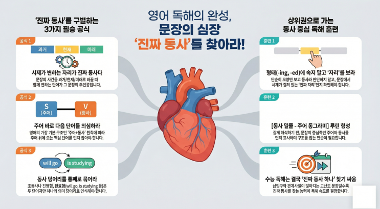 안녕하세요, 라미잉글리시입니다. 상담을 하다 보면 영어가 유독 어렵게 느껴진다는 아이들의 공통점이 하나 있습니다. 단어는 꽤 많이 아는데, 문장이 조금만 길어져도 해석이 멈춰버린다는 점이죠. 그 이유는 단 하나, '동사'를 찾지 못하기 때문입니다. 동사는 문장의 심장입니다. 심장이 어디 있는지 모르면 문장은 '해석'이 아니라 '추측'이 되고 맙니다. 오늘은 우리 아이들이 실전에서 바로 써먹을 수 있는 동사 찾는 법을 정리해 보려 합니다. 1. 동사는 '움직임'이 아니라 '문장의 중심'입니다 보통 아이들은 동사를 "~하다"로 끝나는 말이라고 배웁니다. 틀린 말은....... <img src="https://blogthumb.pstatic.net/MjAyNjAyMTNfMjA3/MDAxNzcwOTU2MTE5MTM1.eWQeaQbNbhPXWs8zk-Fy4TQ_GY1RU3W-IqkuihXfF9Ag.xFxNIthF-rhgobHMDso7knMQJiGCGwIVUdHlGLF3DH0g.PNG/image.png?type=s3" />