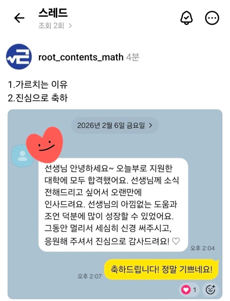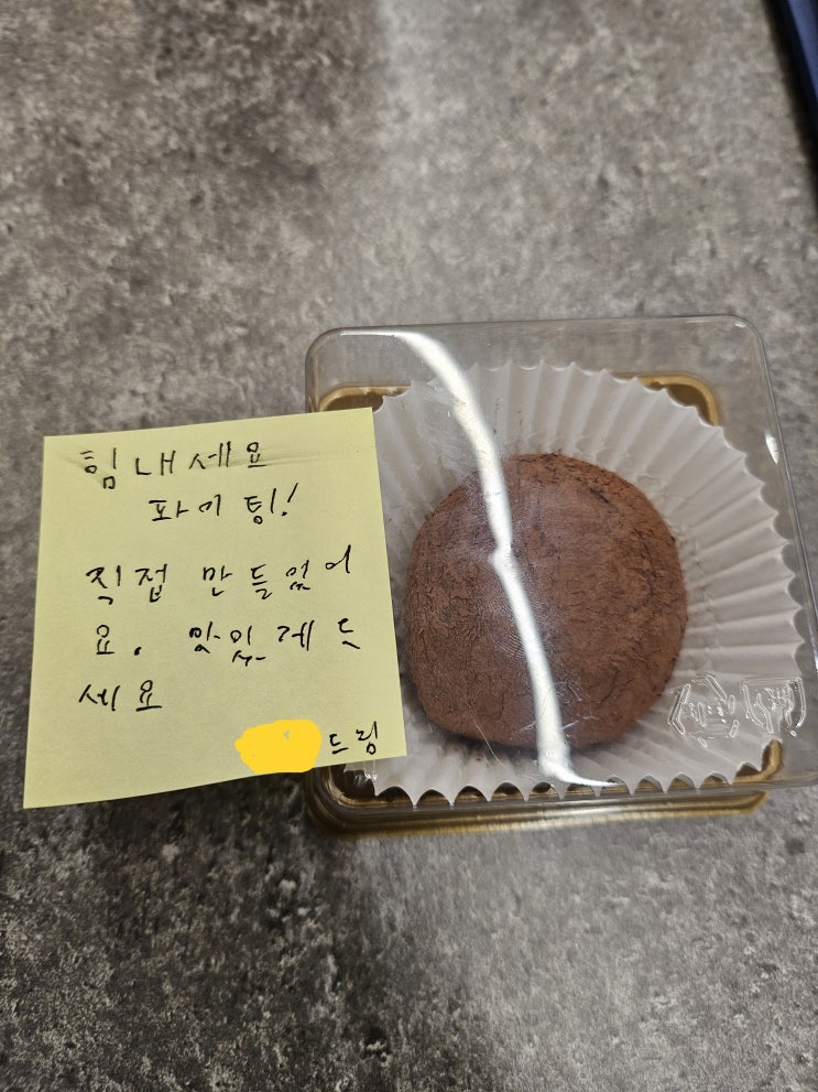 안녕하세요~ 찐쌤입니다~ 오늘 저녁 고등부 수업 시간에 정말 특별한 일이 있었어요!! 초등학교 3학년 남학생이 어머님과 함께 교습소에 잠깐 왔어요~ 그리고는 엄청 부끄러워하면서 제게 무언가를 건네주는데...!! 두바이 쫀득 쿠키를 직접 만들어서 가져온 거예요!!! 투명 용기에 담긴 쿠키 한 개, 그리고 노란 포스트잇에 쓴 메시지: "힘내세요 파이팅! 직접 만들었요, 맛있게 드세요" 이 작은 쪽지 하나에 얼마나 큰 마음이 담겨있는지... 글 쓰면서도 눈물이 나네요.. ㅜㅜ 부끄러워하면서도 용기내서 직접 제 손에 쥐어주던 그 모습... 평생 잊지 못할 것 같아요ㅋㅋㅋㅋ 항상 학생들에게 숙제 선물만 줬더니... 이번엔 학생이 저....... <img src="https://blogthumb.pstatic.net/MjAyNjAxMzBfMTYx/MDAxNzY5NzczNDU1ODcw.L19_WfiduNpO1R_6FUdYRtWL2uwxUC_XuokWbK-unvYg.-eoP_xozKpSy8lVYFGlOKuBA2Icds1yCFsMSPh6s5pog.JPEG/KakaoTalk_20260130_195550684.jpg?type=s3" />