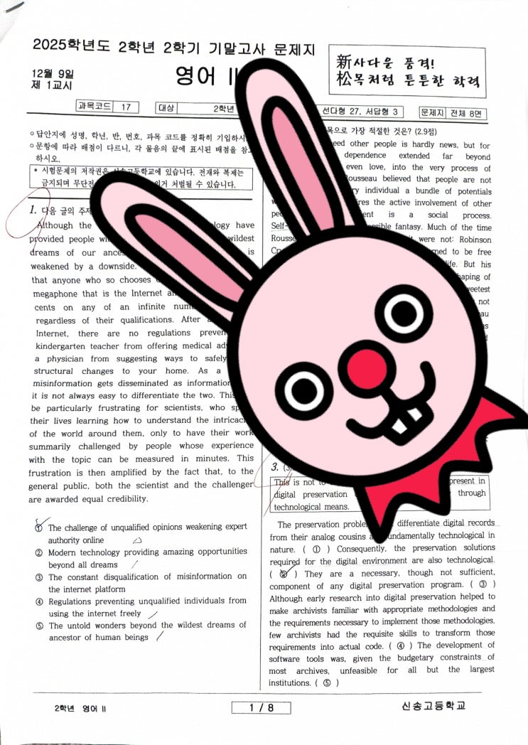 안녕하세요! 늘 내신 시험이 마감하고, 하나하나 다뤘던 학교들을 세세히 분석하는게 중요한데요. 그 이유는 "과거 시험패턴을 알아야 미래 시험패턴이 읽히기 때문"입니다. 그래서 오늘 주T 담당의 분석칼럼 대상 학교는..!! 인천시 연수구 신송고등학교 입니다 2025학년도 신송고 2학년 2학기 기말고사 영어Ⅱ 분석 칼럼 신송고등학교의 시험 스타일이 궁금하시죠? 또, 까다로운 신송고등학교 영어내신을 집중적으로! 소수정예로! 신송고 내신을 철저히 대비시키는 주T입니다. 신송고등학교 시험스타일이라하면 : “독해(구조) + 어법/어휘(정교함) + 서답형(표현)”을 동시에 보는 시험 1) 시험 한 줄 총평 이번 신송고 영어Ⅱ 기말....... <img src="https://blogthumb.pstatic.net/MjAyNTEyMjZfMTY3/MDAxNzY2NzE2NTU4NjI2.O74mykALh-jqOSbUIcI3HIY5LhSpCYGYU2fqRX5P2c8g.bU8iFpGh_eekx4jWSw2ltW_yHLWp_a646OR9_QaRYXAg.JPEG/A556FE53-3537-4D3E-9C0B-042902DB89AE-85024-000026011436FFAC.JPG?type=s3" />