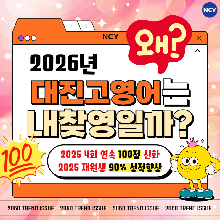 여러분 안녕하세요! 벌써 26년의 한 달이 훌쩍 지나 2월이 성큼 다가왔네요! 한 학년 올라가게 된 것을 축하드립니다. 그리고 또 환영합니다! 짝짝! 예비 고1 학생들은 모두 고등학교 배정이 마무리되었고, 예비 고2 학생들은 2학년을 맞이하느라 매우 바쁠 것 같아요~ 우선 대진고 가족이 되신 여러분 모두 반갑습니다 ♥ 환영합니다 ♡ 대진고는 정말 분당 내 일반고 중에서도 학구열과 학업 수준이 매우 높은, 너무나도 좋은 학교지요. 저희도 그런 학교의 영어 내신을 맡고 있어 자부심이 매우 큽니다! 그.래.서 왜 2026년 대진고 영어 내신은 NCY 내찾영이어야만 하는지! 면밀하게 파헤쳐 드리겠습니다!! 우선, 작년의 성과 먼저 보시겠습니....... <img src="https://blogthumb.pstatic.net/MjAyNjAyMDFfMTE4/MDAxNzY5ODc4NjcyNzI0.KVaKjZyKCVEVbQq1m6YoKZYwy_-Q9pn3ReuitN5nnyYg.DU6FzJfEicPEAqYdZEK-dr2JL9SCz_mz8XY_ZBV7LIYg.PNG/001.png?type=s3" />