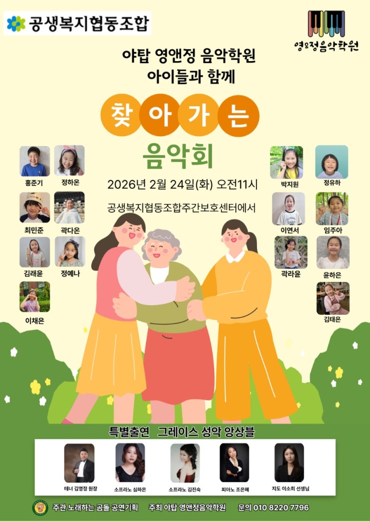 [소식] 야탑 #영앤정 음악학원 아이들과 함께하는 '찾아가는 음악회' 안녕하세요! 오늘은 마음까지 따뜻해지는 훈훈한 공연 소식을 전해드리려고 합니다. 야탑 영앤정 음악학원의 사랑스러운 아이들이 지역 사회를 위해 아주 특별한 선물을 준비했다고 해요. 바로 #공생복지협동조합 주간보호센터에서 열리는 **'찾아가는 음악회'**입니다! 행사 일정 안내 아이들이 정성껏 준비한 이번 공연의 상세 일정은 다음과 같습니다. 일시: 2026년 2월 24일 (화요일) 오전 11시 장소: 공생복지협동조합 주간보호센터 주최: 야탑 영앤정 음악학원 주관: 노래하는 곰돌 공연기획 출연진 소개 이번 음악회는 꿈나무 연주....... <img src="https://blogthumb.pstatic.net/MjAyNjAyMTBfMjQ3/MDAxNzcwNjg5NDI3NzI3.aGjSj8yT_poaUPK1QO8sLEqIiP0oSpz7IzccnEHOlvEg.kkXVk_D_Zh_mDNE7T0p_QHfqKcR-quqMQyXzfFUaTbwg.JPEG/900%A3%DF1770681328049.jpg?type=s3" />