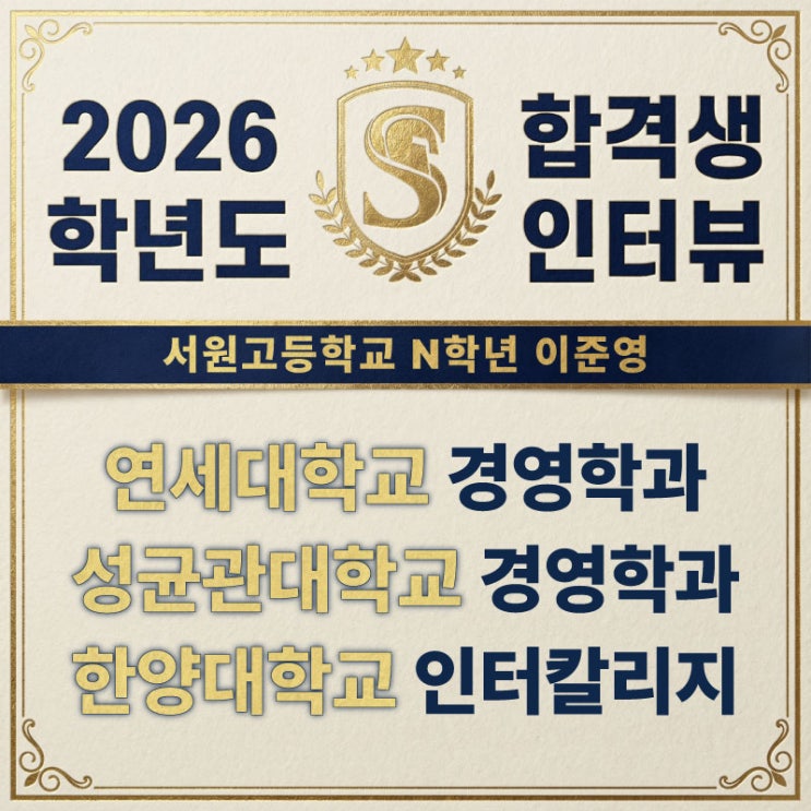 이준영 학생은 정시 전형을 통해 연세대 경영학과, 성균관대 경영학과, 한양대 인터칼리지 학부에 합격한 학생입니다. 수능에서도 매우 우수한 성적을 받았으며, 연세대 경영학과에 진학하기로 한 학생입니다. 수학과 영어 모두 1등급을 받은 학생이며, 어떻게 공부를 해야 하는지 성심성의껏 이야기를 해주었습니다. 인터뷰에 응해준 이준영 학생에게 다시 한번 감사드립니다. <img src="https://blogthumb.pstatic.net/MjAyNjAyMTFfMjc2/MDAxNzcwODAzMDUyMjU2.GvtPKAkKpVnlx0oKMX6PqrTvOagT80IVPOr9pdatgRYg.a0UwYXFwsRjQJa3lFJnA_SkdDzGG1bcNUrXR4lS0HREg.JPEG/%C0%CC%C1%D8%BF%B5.jpg?type=s3" />