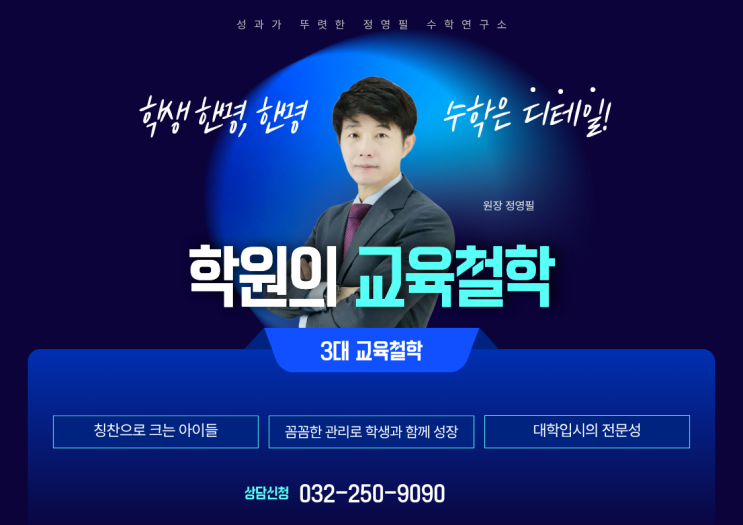 안녕하세요~ 정영필 수학 연구소입니다. 수능을 앞두고 본격적인 준비를 하게 되는 만큼 고등학교 수학은 정말 어렵고 그만큼 중요한 과목인데요. 이렇게 중요한 수학! 정영필 수학 연구소에서는 이렇게 가르칩니다. 저희 교육철학은 칭찬으로 '다닐 맛 나는 학원' , 꼼꼼한 과제 첨삭과 지도로 '구멍 없는 관리', 베테랑 선생님들로 대학입시의 전문성을 갖고 '성과가 뚜렷한 학원' 이라는 3대 교육철학으로 지도하고 있습니다. 고등부에서는 학생별 커스텀 반편성을 진행합니다. 학생 개개인의 특징과 성향에 맞춰 색깔이 다른 두 반으로 나누고 그 안에서 수준별 반편성으로 진행합니다. J-티칭반은 단체수업을....... <img src="https://blogthumb.pstatic.net/MjAyNTEyMThfMjQw/MDAxNzY2MDYyMjQxNjY4.ZUuNO4b5LEXFT2C0_pvn5hRcRP7AjCI3Y3FRmerYhrsg.pPJiFDN_5ymxy-kh0TNrt7Kgee1Xv2CqmF1S918U2LAg.PNG/1.png?type=s3" />