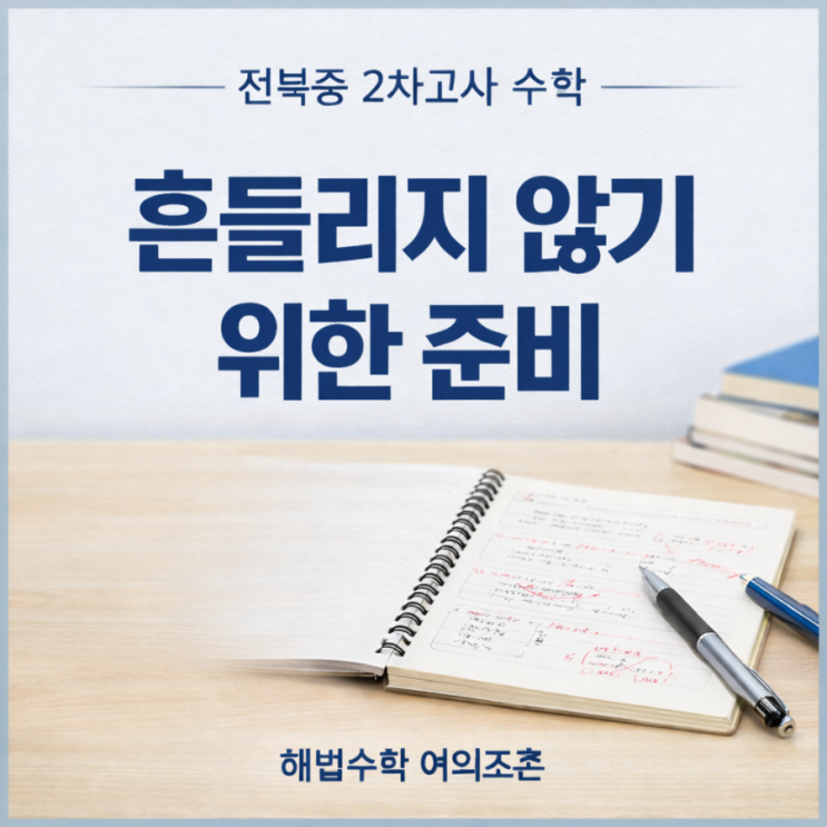 전북중 2차고사 수학 시험일입니다. 1차고사 이후, 아이들이 가진 실력을 100% 다 보여주지 못한 것 같아 원장으로서 고민이 많았습니다. ‘개념은 알고 있는데, 시험에서는 왜 흔들렸을까.’ ‘풀이는 되는데, 왜 정답을 빗겨갔을까.’ 그 질문들을 붙잡고 수업 방식과 학습 과정을 다시 점검했습니다. 그리고 오늘, 드디어 2차고사 시험날을 맞이했습니다. 모든 시험은 중요하지만 학원생의 시험은 아이들만의 시험이 아니라 원장에게도 하나의 시험입니다. 가르친 방향이 옳았는지, 준비 과정이 충분했는지를 함께 확인하는 날이기 때문입니다. 이번 시험을 준비하며 아이들에게 가장 강조했던 수학 공부 방법은 제대로 이해하고, 반복하는 것....... <img src="https://blogthumb.pstatic.net/MjAyNjAxMDhfMjY2/MDAxNzY3ODQ0MzQwMTQw.13GpZLekvnxulSOLl6SOgoLJRbXuBmFuYJphJJvTn58g.c1_6PKNKqCROko3ctzc5GA8gImV999PO19gpV9wutS8g.PNG/900%A3%DFfile%A3%DF00000000df58720b9958310ee44258c8.png?type=s3" />
