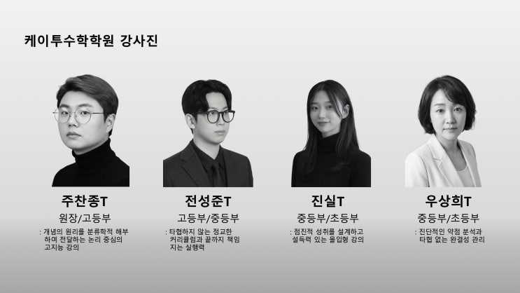 안녕하세요, 케이투수학학원입니다. 많은 학부모님께서 학원을 선택할 때 강사의 강의력을 우선순위로 두십니다. 하지만 화려한 강의보다 더 중요한 것은 '그 강의가 아이의 성적으로 어떻게 치환되는가'입니다 케이투수학학원의 강사진은 단순한 지식 전달자가 아닙니다. 학원의 철학인 **'끈기와 인내'**를 아이들에게 이식하고, **'완벽한 개념 이해'**라는 목표를 달성하기 위해 설계된 시스템 전문가들입니다. 케이투수학학원의 시스템 기반 전문가 그룹 저희 강사진은 각자의 전문 영역에서 학생들의 12년 수학 여정을 함께합니다. 강사진은 단순한 지식 전달자가 아닙니다. 학원의 철학인 **'끈기와 인....... <img src="https://blogthumb.pstatic.net/MjAyNjAyMjJfMjc5/MDAxNzcxNzY4NzYxMjUx.P33Oe8A6v8QaZna_lxPa8haNbEk6tYDRRnc-wg0BmT4g.cjB0FNOF0uGax2LQDAc82a0lVYRkX6rrn1rrZvH2zdQg.JPEG/260220_%B0%AD%BB%E7_%BC%D2%B0%B3.jpeg?type=s3" />