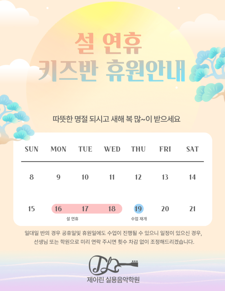 새해가 된지는 한달도 넘었지만^^ 본격적인 설 명절 진짜 새해가 시작됩니다. 후곡 J린 키즈반 휴원일 안내드립니다. 2026년에는 조금 더 천천히, 그러나 더 깊이. 속도보다 방향을 생각하며 아이 한 명, 한 명의 음악을 만들어가겠습니다. 올해도 제이린 실용음악학원에서는 ‘잘 치는 아이’보다 ‘즐기며 성장하는 아이’를 응원합니다. 각자의 자리에서 새해를 시작하는 모든 가정 위에 따뜻한 리듬이 흐르길 바랍니다. 새해에도 우리, 즐겁게 소리 내볼까요? #음악하는아이들 #실용음악하는아이들 #실용음악초등반 #기타치는어린이 #드럼치는어린이 #노래하는어린이 #일산후곡실용음악학원 #제이린키즈반에서 #함께연주해요 <img src="https://blogthumb.pstatic.net/MjAyNjAyMTNfMTUw/MDAxNzcwOTY0NDA4Nzg3.9-kieFwFTP7DB9e73RKqJRe1EM1_Q04kQTD8Tt4Dflkg.q2Pe61QISkuCftbPF1BeVAIkjWHqzIeHaHqc_AjwkPkg.PNG/%BC%B3%BE%C8%B3%BB.png?type=s3" />