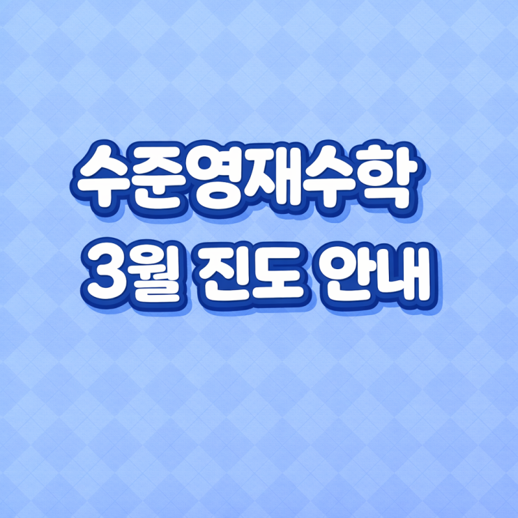 수준영재수학 3월 진도 안내 3월은 새 학기의 시작과 함께 본격적인 정규 진도가 출발하는 시기입니다. 수준영재수학은 3월을 단순한 ‘선행’이 아니라, 개념을 정확히 잡고 심화까지 연결하는 출발점으로 운영합니다. 각 반별 세부 진도와 시간표는 아래에 첨부된 이미지 자료를 통해 확인해 주세요. 초등 프로그램 (3월) 초등 과정은 개념 → 심화 → 사고력의 3단 구조로 운영됩니다. 개념을 정확히 이해하고 그 개념을 문제에 적용하는 연습을 거친 뒤 사고력 문제를 통해 문제 해석력과 논리적 사고를 함께 키웁니다. 3월에는 겨울방학 동안 다진 기초 위에서 정규 학기 진도를 안정적으로 출발하는 데 초점을 둡니다. 속도보다 개념....... <img src="https://blogthumb.pstatic.net/MjAyNjAyMTlfMTU5/MDAxNzcxNTAxODM4OTQ0.7c7rpbojsr7WA9nMw4kguxAuce1I24kBKAPXSuNlwZ0g.Yj3r1a44BJephnOOObKX5nxcU-Wyv-F-kSmx6MERJrMg.PNG/ChatGPT_Image_2026%B3%E2_2%BF%F9_19%C0%CF_%BF%C0%C8%C4_08_44_59.png?type=s3" />