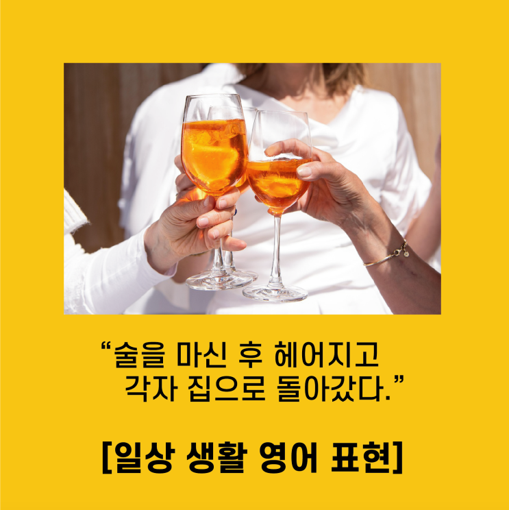술을 마신 후 헤어지고 각자 집으로 돌아갔다. 는 영어로 어떻게 표현할까? 일상 생활에 대한 표현 방법 After drinking, we parted ways and went home.(가장 자연스럽고 간단한 표현) 여기서 part는 동사로 쓰여서 헤어지다라는 뜻으로 쓰입니다. 2. After having Some drinks, We said goodbye and each went back home. -조금 더 구체적으로 표현 할 때 이 문장을 사용할 수 있습니다. 3. After drinking together, we split up and headed to our own homes. (대화체, 친근한 느낌의 표현) 지금까지 연수동 성인 오픽 영어학원 연수영어학원이었습니다. 감사합니다^^ #연수동오픽영어 #연수동성인영어 #연수동1:1영어 #연수동영어학원 #연수....... <img src="https://blogthumb.pstatic.net/MjAyNjAxMTdfMjY0/MDAxNzY4NjM3MjY4Mzc1.9WXuGdVESGJ_dXbqgdIFrepQ7KwlVLYJalIwPDMlEzYg.8PC5rDUFmMXOqpTPzMiGH4W4RTgFrB6_1G-g8-NWmjog.PNG/%BD%BA%C5%A9%B8%B0%BC%A6_2026-01-17_%BF%C0%C8%C4_4.43.40.png?type=s3" />