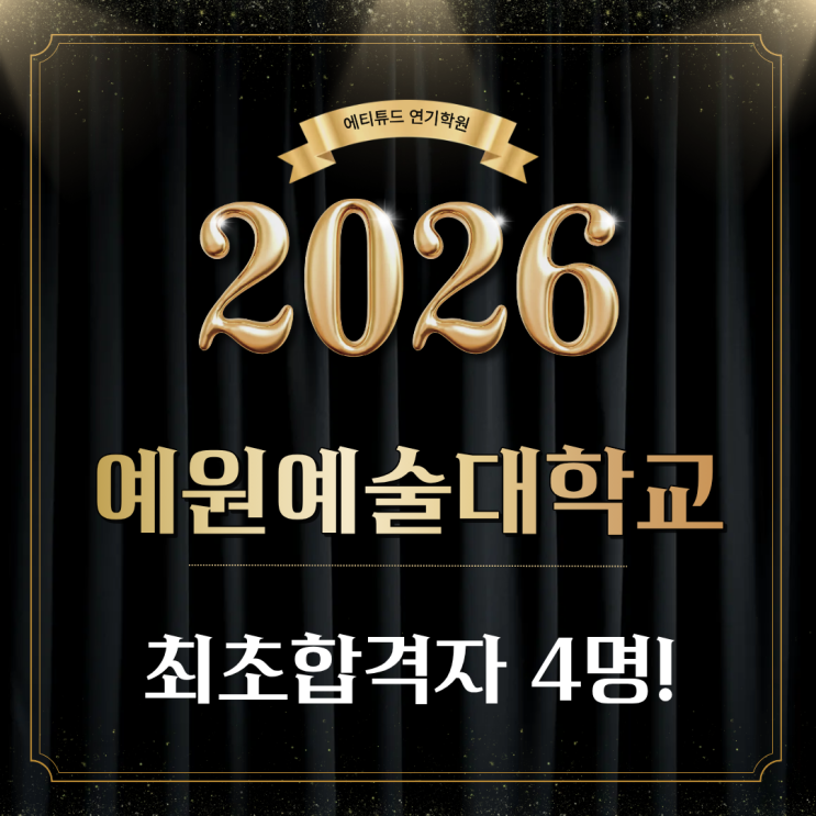 안녕하세요:) 인천연기학원, 에티튜드연기학원에서 2026학년도 입시의 압도적인 결과를 전해드립니다! 이번 예원예술대학교 연극영화전공 정시 모집에서 인천연기학원, 에티튜드연기학원은 모집 인원 3명 전원을 합격시키는 전례 없는 성과를 거두었습니다. 수시 최초 합격자 1명을 포함하여, 예원예술대학교에서만 총 4명의 최초 합격자를 배출했고 이를 통해 입시 연기의 전문성을 다시 한번 입증했습니다. 2026 예원예술대학교 최초 합격자 <수시 최초 합격> 이 O 우 <정시 최초 합격> 마 O 찬 안 O 규 홍 O 교 - 정시 모집 정원 3명, 합격자 전원이 에티튜드 수강생이며, 예비 번호가 아닌 '최초 합격'으로만....... <img src="https://blogthumb.pstatic.net/MjAyNjAxMjVfMjgw/MDAxNzY5MzQxMDUzMzEw.-iE_vXyCICKl7z64Ll1utwBA8HoUrPsQ7FRWCJLeW3Mg.BXNShZmGxYpa1Nl5RLu7qfwxhBM0pXk1ipyEcdfpFwUg.PNG/1.png?type=s3" />