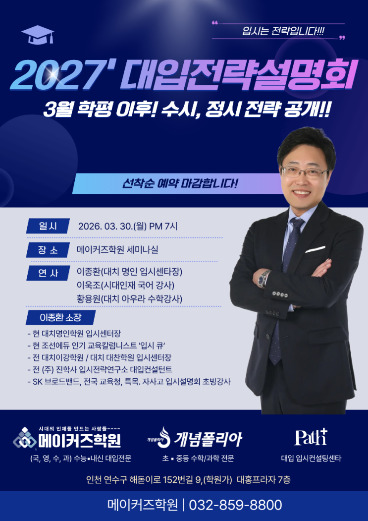 "입시는 전략입니다!!!" 현 입시제도의 마지막 대입!!!! 혼란스러울 수록 정확한 입시 정보와 분석에 의한 전략으로 대학 합격의 문은 넓어집니다!!! 상담전화 032-859-8800 ♣ 2027' 3월 학평 이후! 고3 수시•정시 전략 설명회 ♣ 일 시 : 2026. 03. 30.(월) PM 7시 ♣ 장 소 : 메이커즈학원 세미나실 ♣ 연 사 : 이종환 소장 / 이욱조(국어) 수능전문강사 / 황용원(수학) 수능전문강사 ♣ 내 용 ○ 3월 학평 결과, 올해 수능 난이도와 입시 판도는? ○ 3월 학평 성적대별 현실 진단, “지금 성적으로 갈 수 있는 대학은?” ○ 상위권 입시 핵심 변수! 의대 정원 변화 이후 합격선 전망 ○ 고3 수시 vs 정시 전략, 지....... <img src="https://blogthumb.pstatic.net/MjAyNjAzMTZfMTI0/MDAxNzczNjUwNzk4NDE3.mdYGMlnjdv_D5UmUB1wlI8as29iuJt1HsIxobziXrDwg.wYqVuuX1-Vi1rnnW8iXmZGzuN7T8PzFZO327Eer-qwAg.PNG/%C0%CC%C1%BE%C8%AF_%BC%B3%B8%ED%C8%B8%281%29.png?type=s3" />