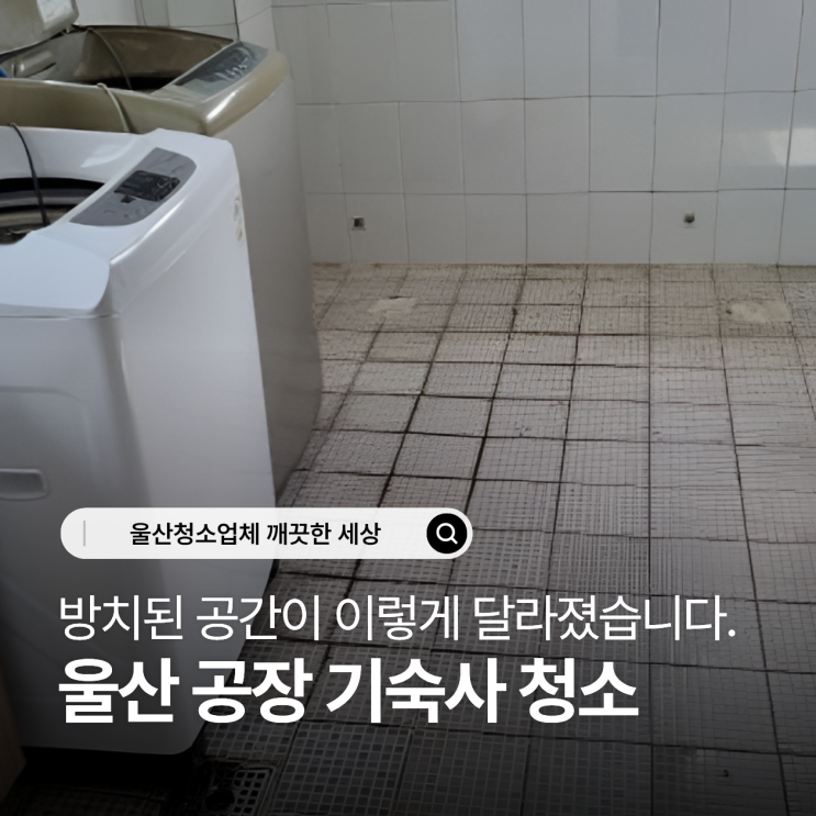 안녕하세요 울산 청소업체 깨끗한 세상입니다. 목차 1.현장 점검 2.울산 기숙사 청소 과정 3.바닥 청소 가정집과 달리 공장 기숙사와 같은 부대시설은 규모가 크고 관리 범위가 넓어 개인이 꼼꼼하게 청소하고 관리하기가 쉽지 않습니다. 넓은 복도부터 공용 공간까지 신경 써야 할 곳이 많기 때문인데요 더욱이 이번 현장과 같이 한동안 방치되었던 공간이라면 더욱 전문가의 손길이 필요합니다. 현장 점검 이번에 방문한 곳은 공장 옆 사무동 건물 내에 위치한 기숙사였습니다. 좁고 가파른 계단으로 연결된 구조라 고성능 광택 기와 각종 청소 장비를 좁은 통로로 운반하는 것부터가 큰 숙제였는데요 하지만 현장 경험이 풍부한 작업자들....... <img src="https://blogthumb.pstatic.net/MjAyNjA0MjRfNCAg/MDAxNzc3MDA4NTI0NjUy.YdNXgafMWS_ei-FRg9HbkfyH1ixruxL3GoIATeDmaJwg.bKFzmiU34PoyhdSiwyfCa8baohYXN6gBniyK6OeRR2cg.PNG/7.png?type=s3" />