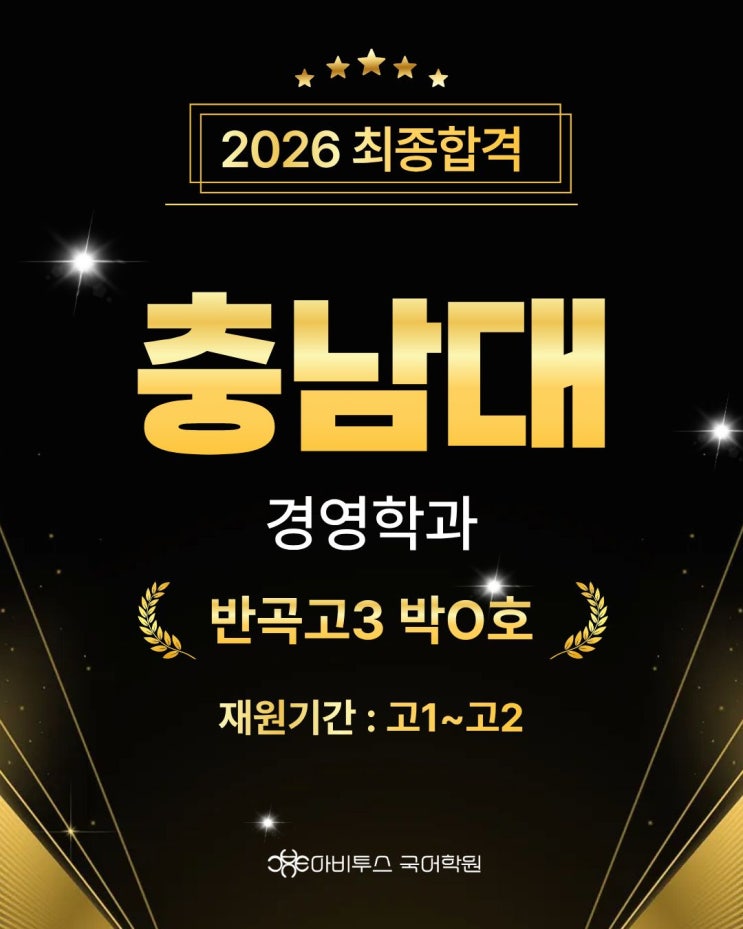 반곡동 국어학원 아비투스 국어입니다 본원에서 고1~고2 까지 약 24개월을 재원한 반곡고3 박O호 학생이 2026 수능에서 좋은 결과를 얻어 충남대학교 경영학과에 합격 하였습니다 O호의 빛나는 대학생활을 응원합니다^^ <img src="https://blogthumb.pstatic.net/MjAyNjAyMTFfMjgw/MDAxNzcwODA4MDkzNzQ3.Mv8Ti-j9ijVXq0-CDQe04TuJbrVaNNPDS6pIa5AQhjAg.fXAMAsbUzKiKYZLEuW9KxxqbiOBKNlTsp11x3QG4gFkg.JPEG/%B9%DA%B0%C7%C8%A3.jpg?type=s3" />