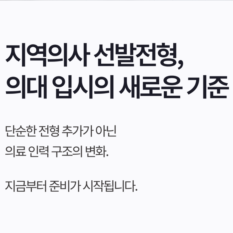 지역의사 선발전형 도입이 의미하는 변화 최근 보도된 기사에 따르면 지역의사제 시행에 따라 지역의사 선발전형이 대학입시에 새롭게 반영됩니다. 이는 단순히 전형 하나가 추가되는 수준이 아니라 의료 인력의 구조를 바꾸는 정책적 변화입니다. 지역 의료 공백을 해소하기 위해 지역에서 공부하고 성장한 학생을 선발해 일정 기간 지역에서 근무하도록 하는 제도이기 때문에 중학교와 고등학교 선택 단계부터 전략적 접근이 필요해졌습니다. 특히 비수도권 학생들에게는 새로운 기회가 될 수 있으며 경기 인천 일부 지역 또한 별도 기준이 적용되므로 지역 요건을 정확히 이해하는 것이 중요합니다. 이제는 막연한 의대 준비가 아니라 제도 흐....... <img src="https://blogthumb.pstatic.net/MjAyNjAyMTRfMjc3/MDAxNzcxMDQ0NTcwNDU5.ux1bOB1dvqvE71wOk-Bem1FQ7beytL-gnsTPfyye86cg.1HSK1AuJ6IrtnfiYqksmMyyBHtk1CZTuKvD7MmYEOJcg.PNG/image.png?type=s3" />