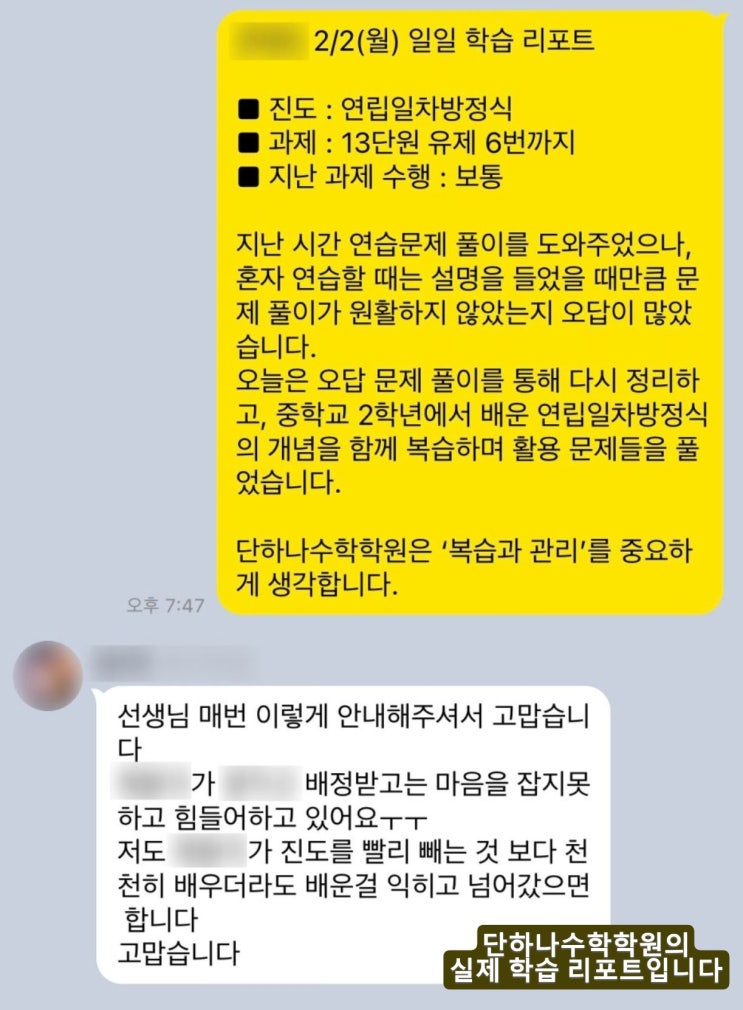 안녕하세요. 단하나수학학원입니다. 중학교 3학년 공통수학1 시작반 개강 안내입니다. 우리 아이 수학 공부는 어떻게 하고 있나요? 부모님께서 얼마나 우리 아이에 대해 관심을 가지고 있는지 궁금합니다. 수학 진도는 어디를 배우고 있는지? 과제는 평소 잘 해가고 있는지? 우리 아이의 실력은 어느정도인지? 어떤 부분에서 취약하고 강점을 가지고 있는지? 그냥 학원에 보내고 알아서 잘 관리해주겠지 라고 생각하시나요? 부모님의 관심이 우리 아이를 더 열심히 공부할 수 있게 만들 수 있습니다. 학원에서 진짜 관리받고 있나요? 중고등부에 올라오면서 많은 학부모께서 이렇게 말씀하십니다. 고등부는 원래 그래요~ 고등부는 상담전화 원래....... <img src="https://blogthumb.pstatic.net/MjAyNjAyMTRfOTkg/MDAxNzcxMDM0OTU2NTQz.vhFnhVa_Fe7WEnM04cd15-GALYPJjDIbwHmThNwS8Jog.DOg7zyL-IICcD3FOcViVw9f4R-ZzAhDLcEianFL-CBAg.JPEG/%C4%B8%C3%B311.JPG?type=s3" />